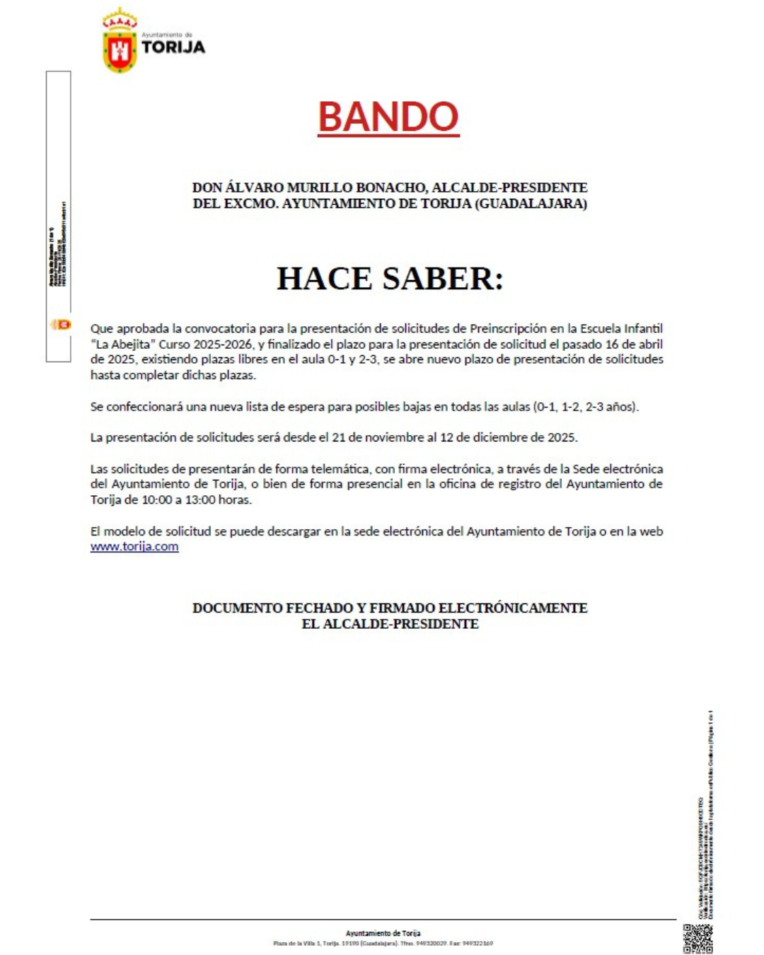 El Ayuntamiento de Torija ha anunciado la reapertura del plazo de preinscripción para la Escuela Infantil "La Abejita" para el curso 2025-2026. La decisión se ha tomado tras completarse el periodo inicial de solicitudes el pasado 16 de abril y confirmarse que aún quedan plazas disponibles en las aulas de 0-1 y 2-3 años. Las familias interesadas podrán presentar sus solicitudes desde hoy, 21 de noviembre hasta el 12 de diciembre de 2025.