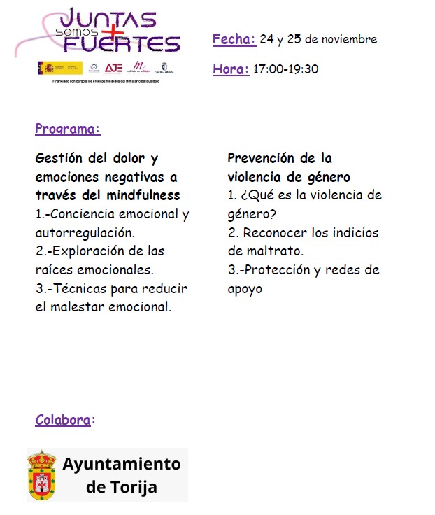 El Ayuntamiento de Torija ha organizado un programa formativo centrado en la gestión del dolor y las emociones negativas mediante el mindfulness, junto con un módulo específico dedicado a la prevención de la violencia de género, con motivo del Dia Internacional de la eliminación de la violencia contra la mujer. El taller, que se desarrollará esta tarde y mañana de 17:00 a 19:30 horas en la sala polivalente de la Biblioteca Municipal, abordará la conciencia emocional, la exploración de las raíce(...)