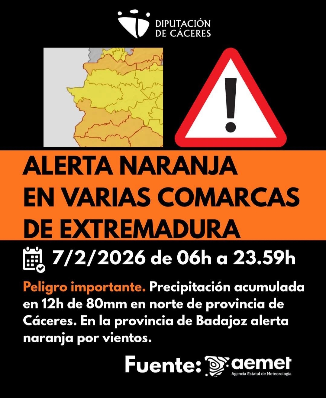 Se amplia la alerta meteorológica a nivel NARANJA, por lluvias para la Zona Norte de la PROVINCIA de CÁCERES desde las 06:00h del 07.02.26 hasta las 00:00h del 08.02.26 por precipitaciones acumuladas en 12 horas de 80mm.