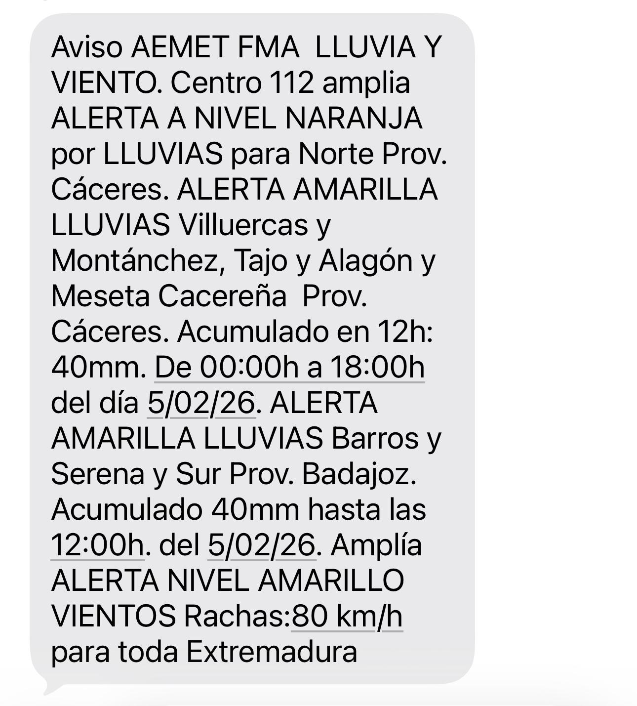 Desde el 112 Extremadura nos informan de que mañana, jueves, 5 de febrero, estará vigente una ALERTA NARANJA por LLUVIAS para la ZONA NORTE de Cáceres desde las 00:00 horas del 5 de febrero hasta las 18:00 horas del 5 de febrero ,con precipitaciones de hasta 80 mm, junto a una alerta amarilla por VIENTO.