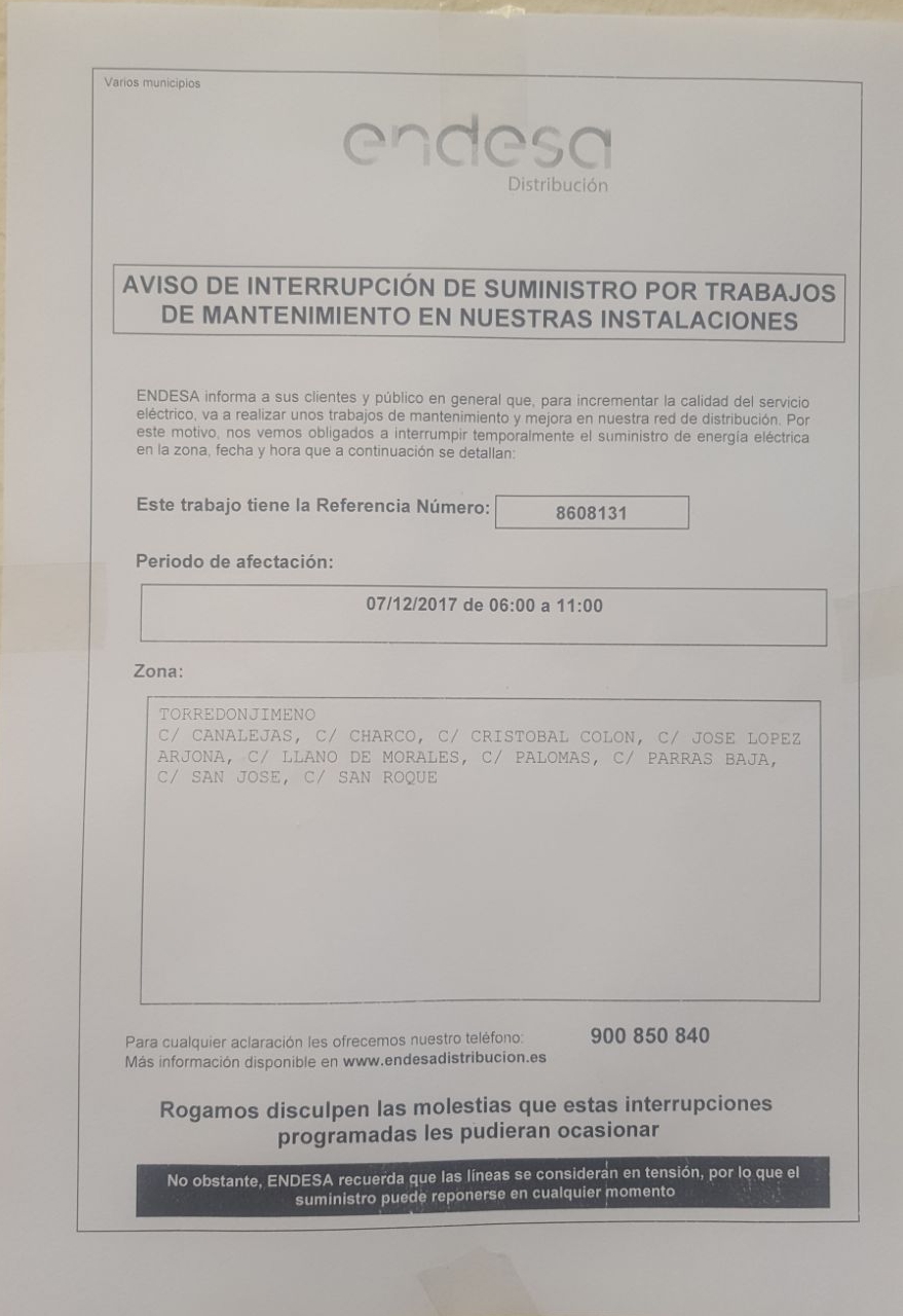 Día 7 de 6.00 a 11:00 horas interrupción del suministro de luz en Calles: Canalejas, El Charco, Cristóbal Colón, José López Arjona, Llano Morales, Palomas, Parras Baja, San José y San Roque