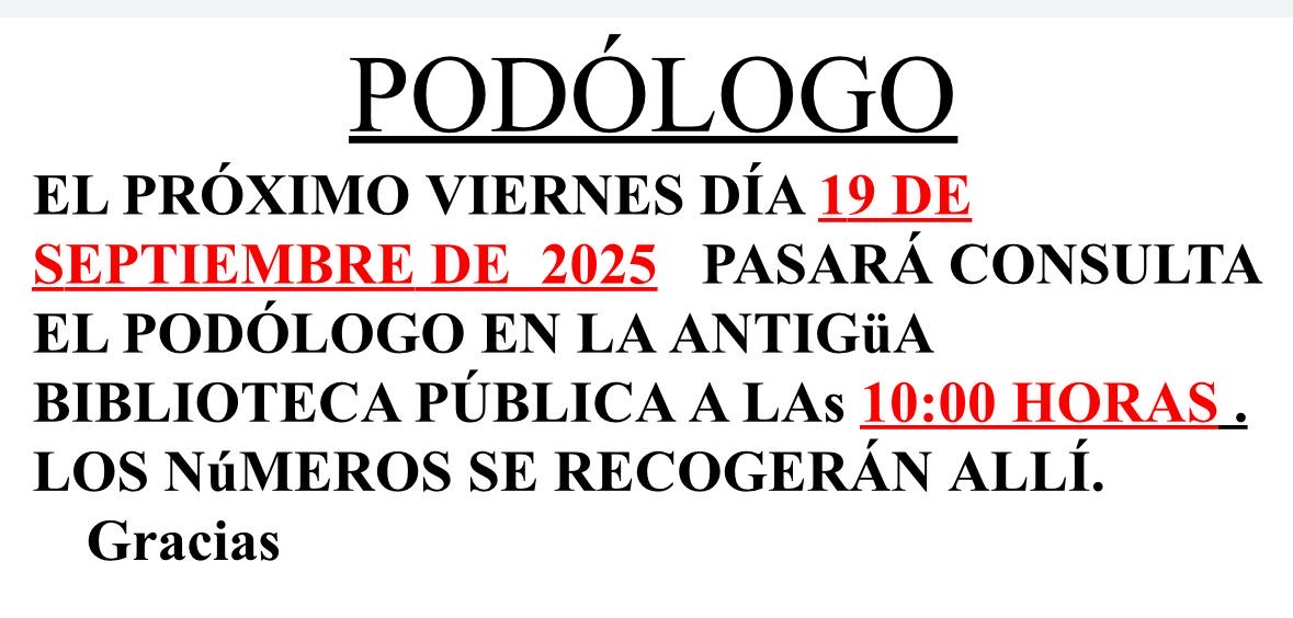 EL PRÓXIMO VIERNES DÍA 23 DE MAYO DE 2025 A LAs 10:00 H DE LA MAÑAnA PASARÁ CONSULTA EL PODÓLOGO EN LA ANTIGUA BIBLIOTECA PÚBLICA.
