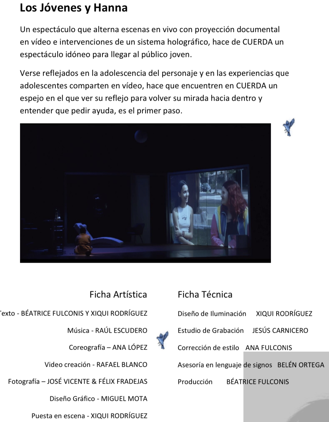Béatrice Fulconis y Xiqui Rodríguez firman al alimón el texto de ‘Cuerda’, partiendo de la idea original de Béatrice y con dirección de escena de Xiqui. Los dos son también los actores en escena (¡estupendos!), acompañados a través de intervenciones en vídeo de Olga Mansilla, Javi Martín, Lola Herrera y Pablo Rodríguez.