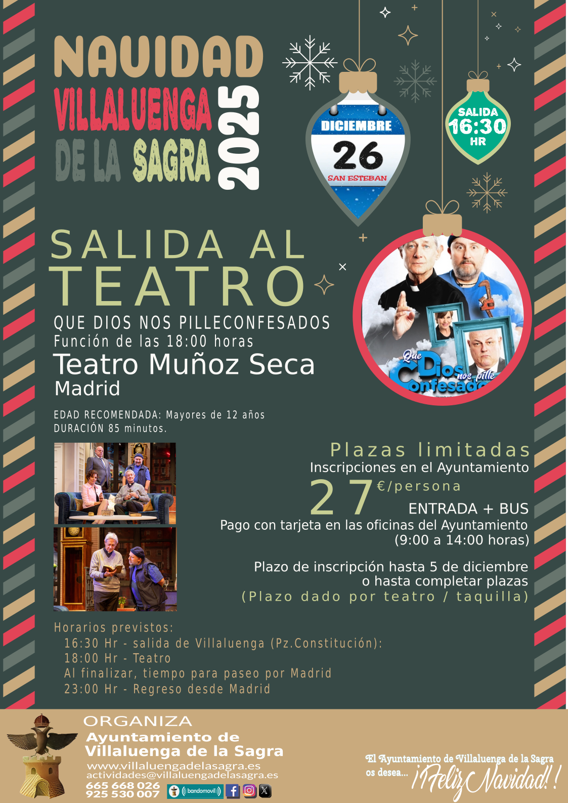 Desde el Ayuntamiento de Villaluenga de la Sagra organizamos una salida al Teatro Muñoz Seca de Madrid el próximo 26 de diciembre, donde podremos disfrutar de la obra “Que Dios nos pille confesados”.