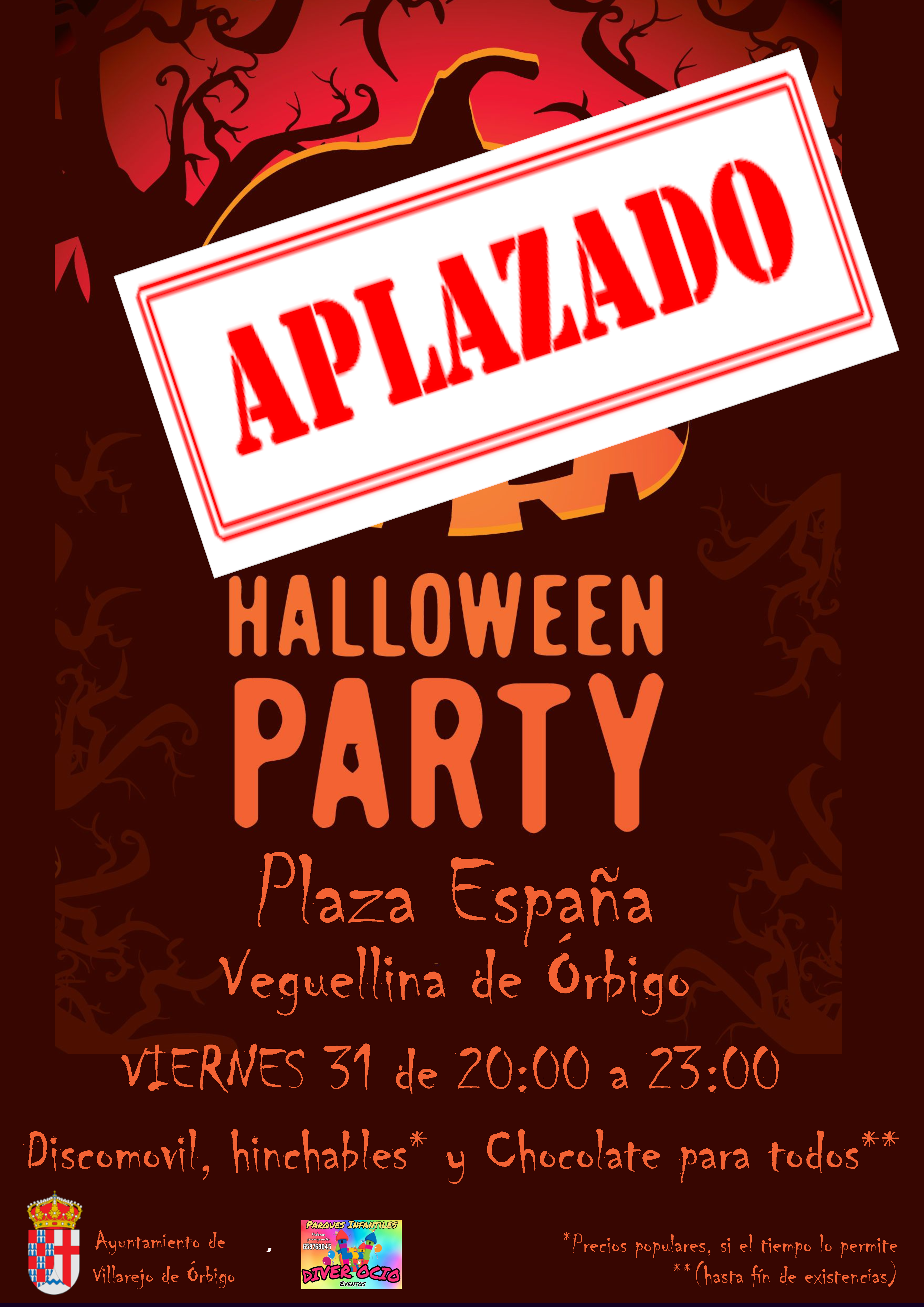Ante las fuertes rachas de viento y la previsión de lluvias fuertes para la tarde de hoy viernes 31 de octubre, el Ayuntamiento de Villarejo de Órbigo ha decidido aplazar la Fiesta de Halloween (hinchables, chocolate y discotecamovil) programada para hoy y trasladarla al viernes 7 de noviembre en la Plaza Elena Santiago de Veguellina de Órbigo.