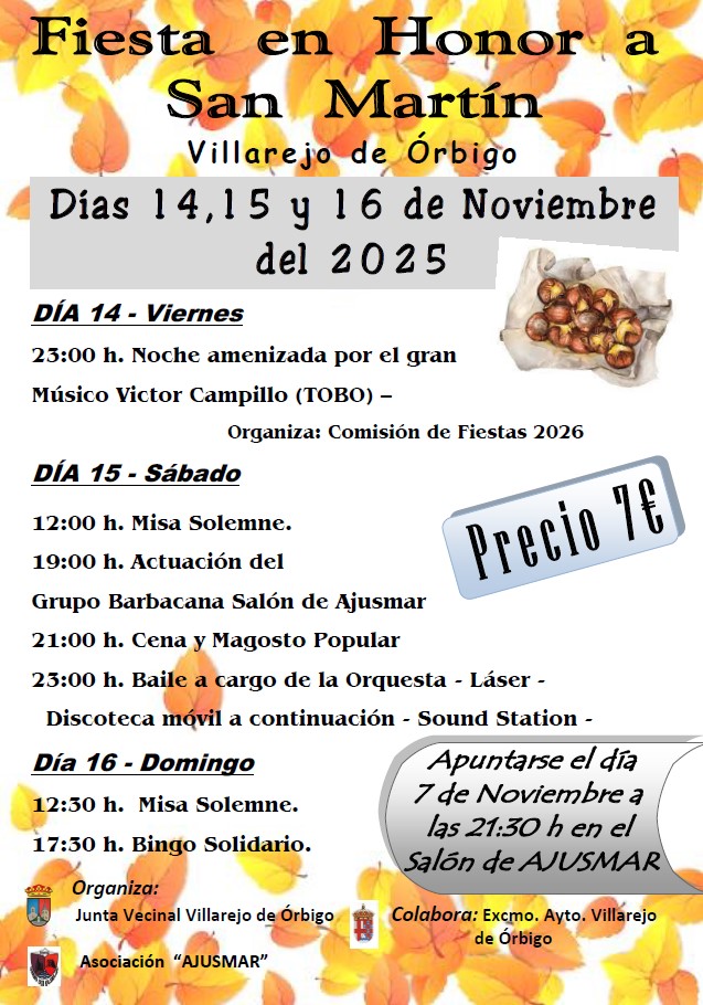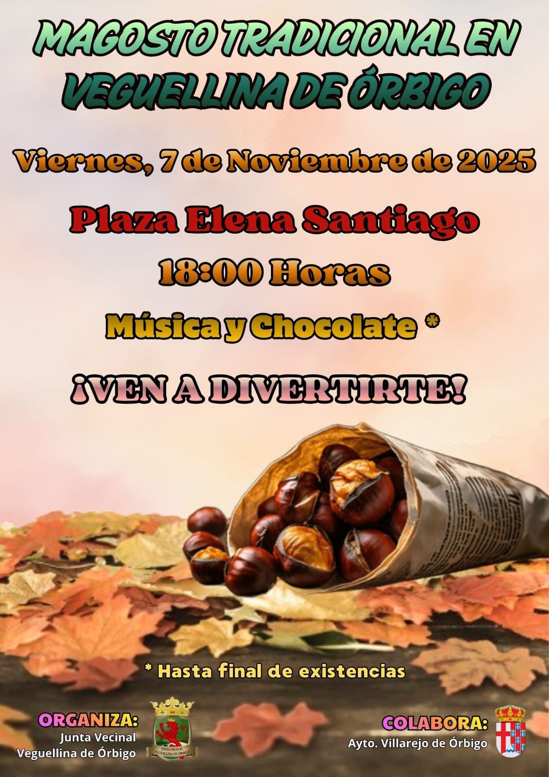 El viernes 7 de noviembre desde las 18:00 horas en la plaza Elena Santiago de Veguellina de Órbigo, podremos disfrutar de una tarde tradicional de castañas, chocolate, música e hinchables. Organizado por la Junta Vecinal de Veguellina de Órbigo en colaboración con el Ayuntamiento de Villarejo de Órbigo