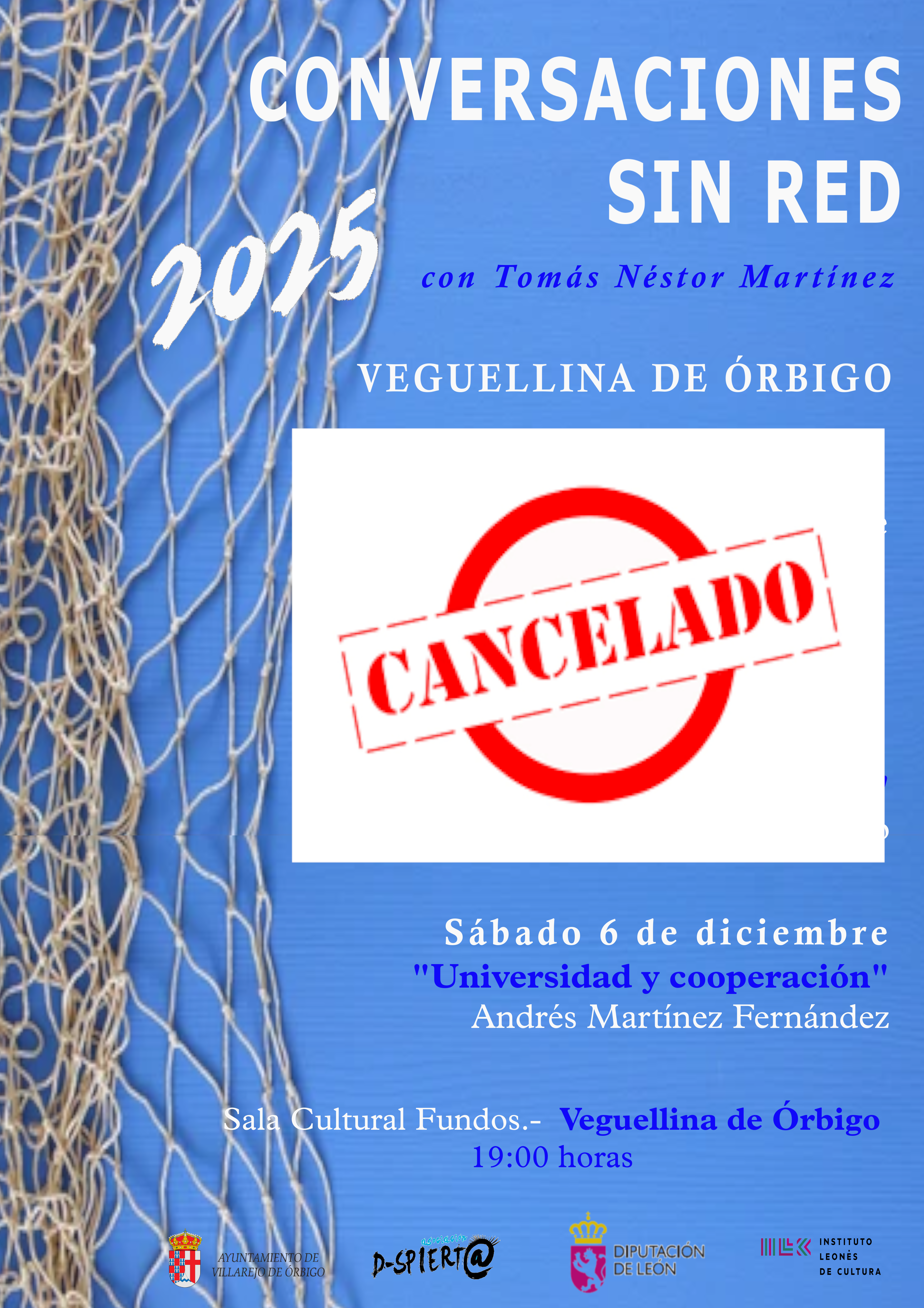 La "Conversación sin red" que se iba a celebrar el próximo sábado 6 de diciembre , a las 19:00 horas en la Sala Cultural Fundos de Veguellina de Órbigo, queda CANCELADA hasta el mes de enero por diversos motivos.