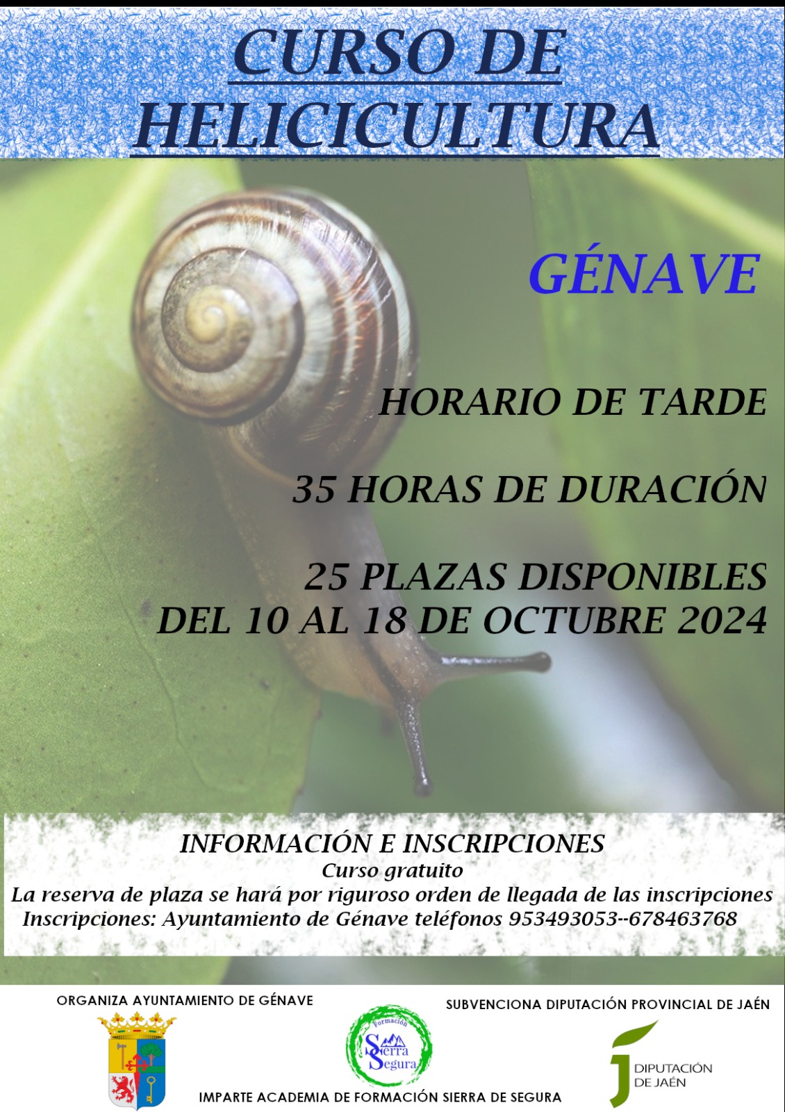 Del 10 al 18 de octubre 2024 se va a impartir curso de de helicicultura en horario de tarde, 35 horas de duración y 25 plazas.Inscripciones en el ayuntamiento.