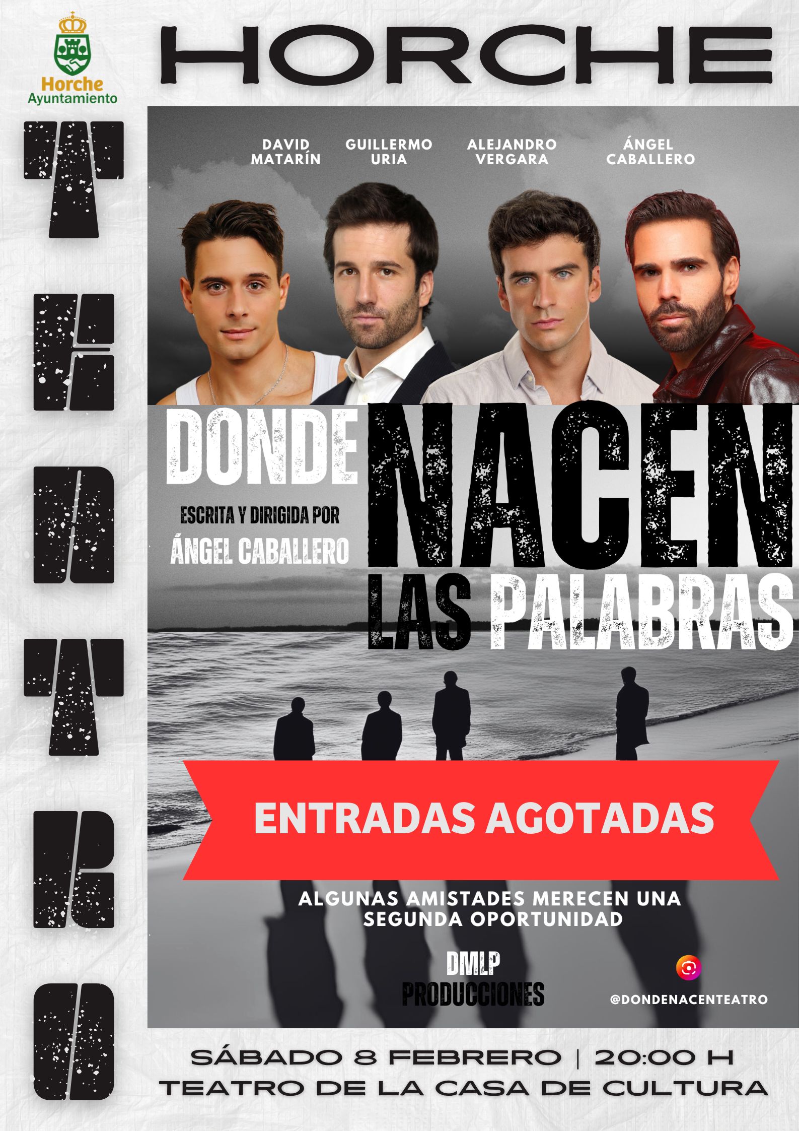 Las entradas para presenciar la representación teatral que tendrá lugar este sábado en el Teatro de la Casa de la Cultura de Horche bajo el título de 'Donde nacen las palabras', dirigida por Ángel Caballero, están AGOTADAS.