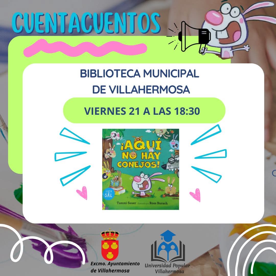 El próximo viernes, día 21 de febrero, a las 18,30 horas, tenemos una nueva actividad de cuentacuentos para los más peques en la UP Biblioteca Villahermosa, con el cuento 🏠 "Aquí no hay conejos"🐇🐇