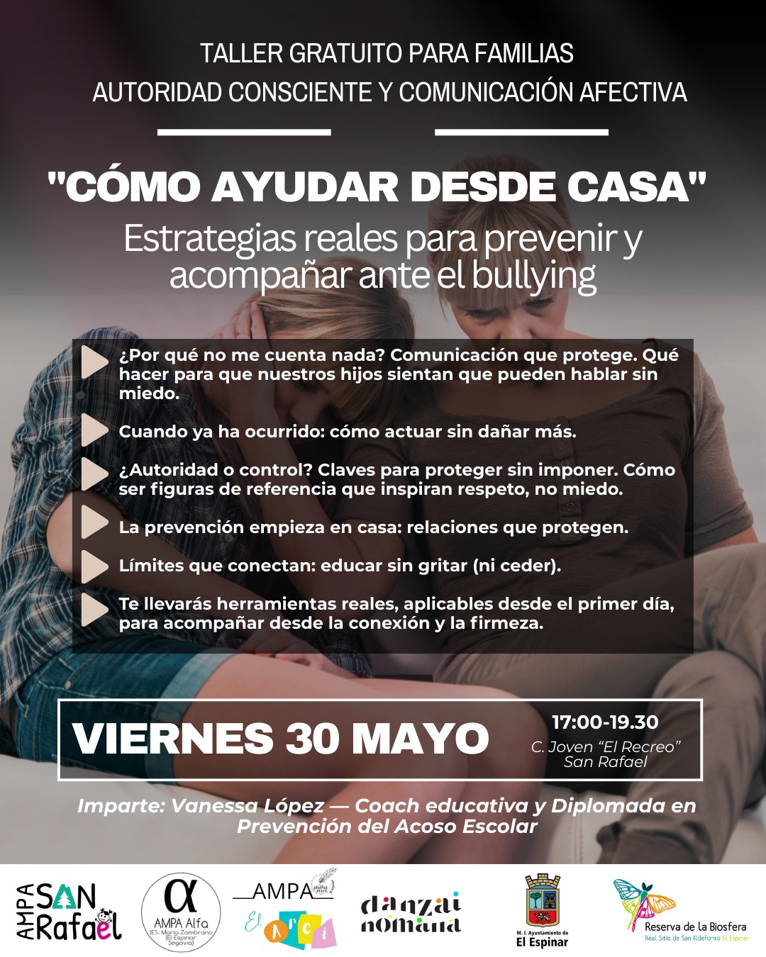 Este mes en el Centro Joven El Recreo, de San Rafael, de 17 A 19.30h, os invitamos a participar en dos talleres gratuitos pensados especialmente para madres, padres y cuidadores que quieren prevenir y acompañar de verdad, si el bullying aparece en la vida de sus hijos: