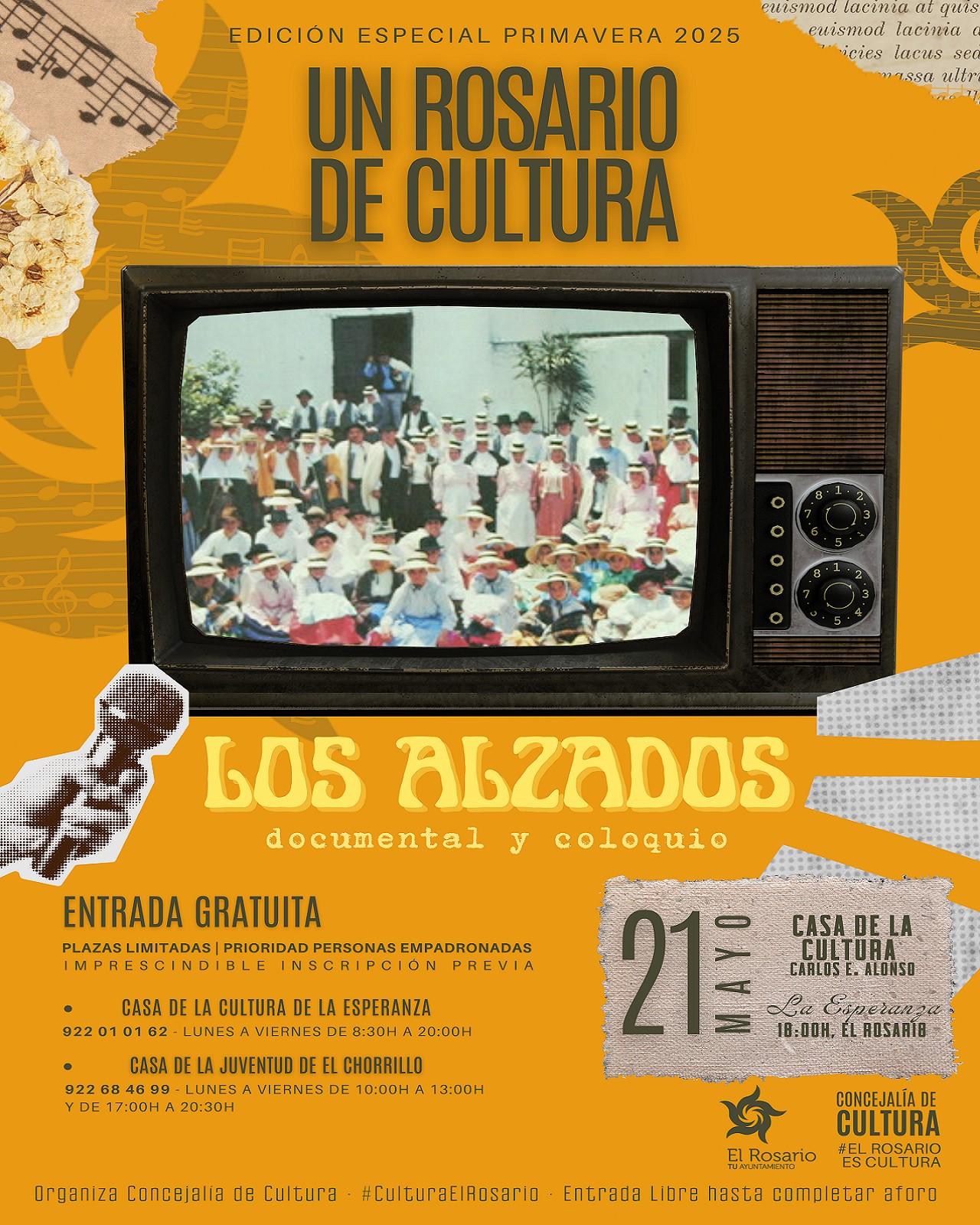 Dentro del ciclo "Un Rosario de Cultura", especialmente dedicada al Día de Canarias en este mes de mayo, la Casa de la Cultura "Carlos Alonso" de El Rosario, en La Esperanza, acoge la proyección del documental etnográfico "Los Alzados" sobre el grupo de música tradicional "Los Alzados", de Icod de los Trigos, de la que formaron parte maestros, como don Elisio Díaz Rodríguez, miembro de la Familia “Los Verga” de La Esperanza. La proyección irá seguida de un interesante coloquio y tendrá lugar el miércoles 21 de mayo, a partir de las 18:00 horas. ENTRADA GRATUITA.