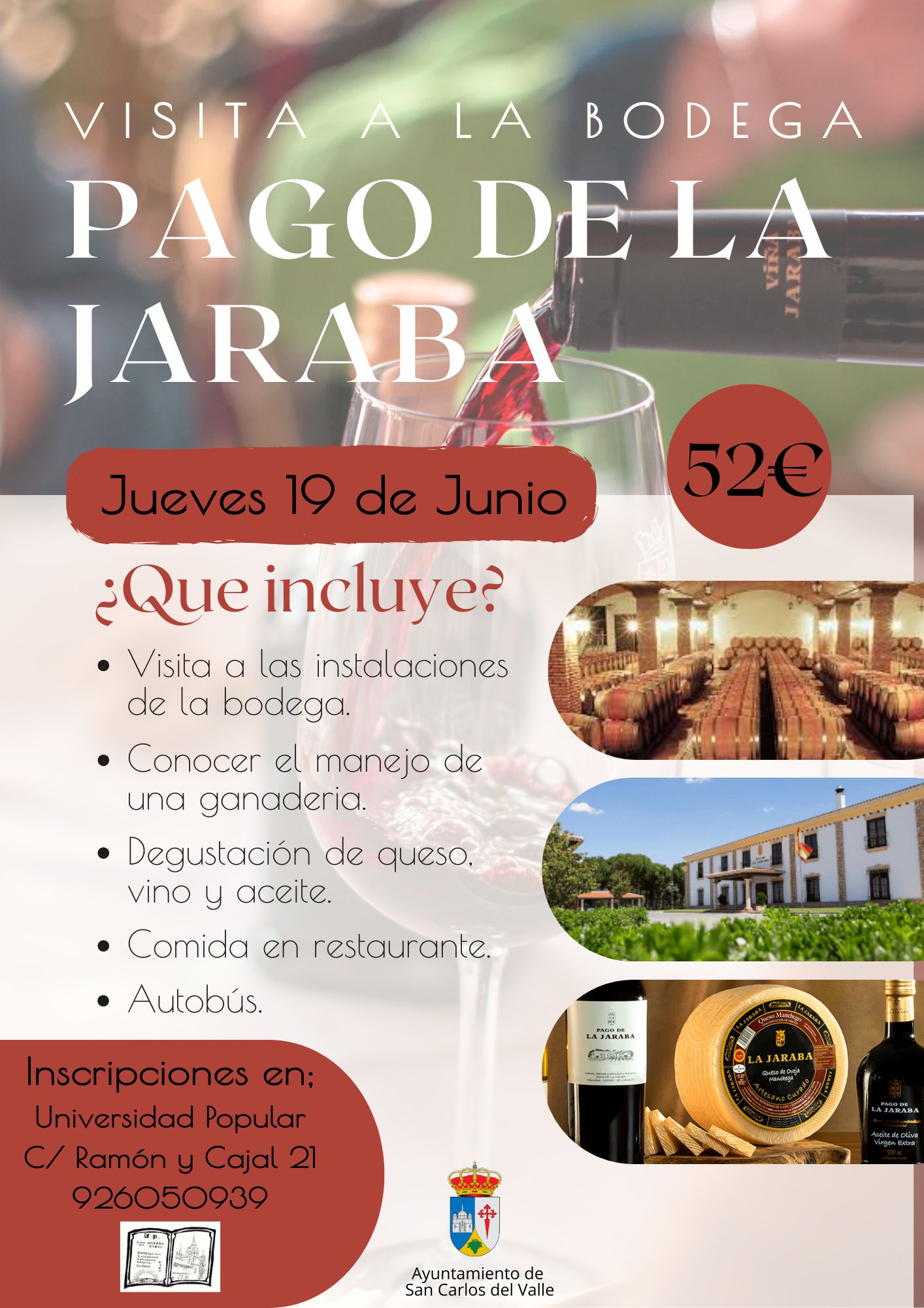 La Universidad Popular organiza una visita a la bodega PAGO DE LA JARABA, de Villarrobledo. La visita incluye diversas actividades y comida en el restaurante.Inscripciones en la oficina de la Universidad Popular.