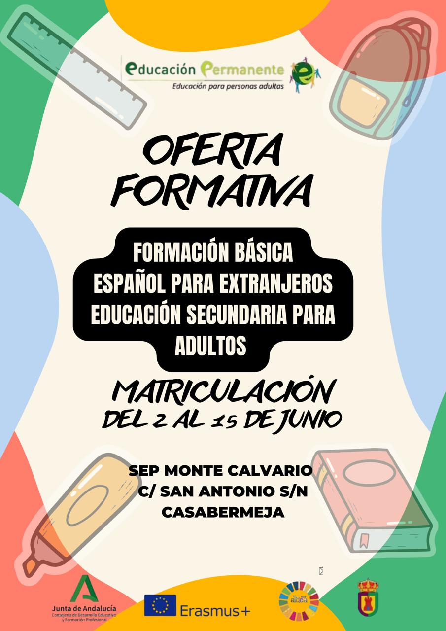 Desde el Ayuntamiento de Casabermeja informamos que ya est谩 abierto el plazo de matriculaci贸n para el curso 2025/2026 en el SEP Monte Calvario, dirigido a personas adultas que deseen continuar con su formaci贸n.