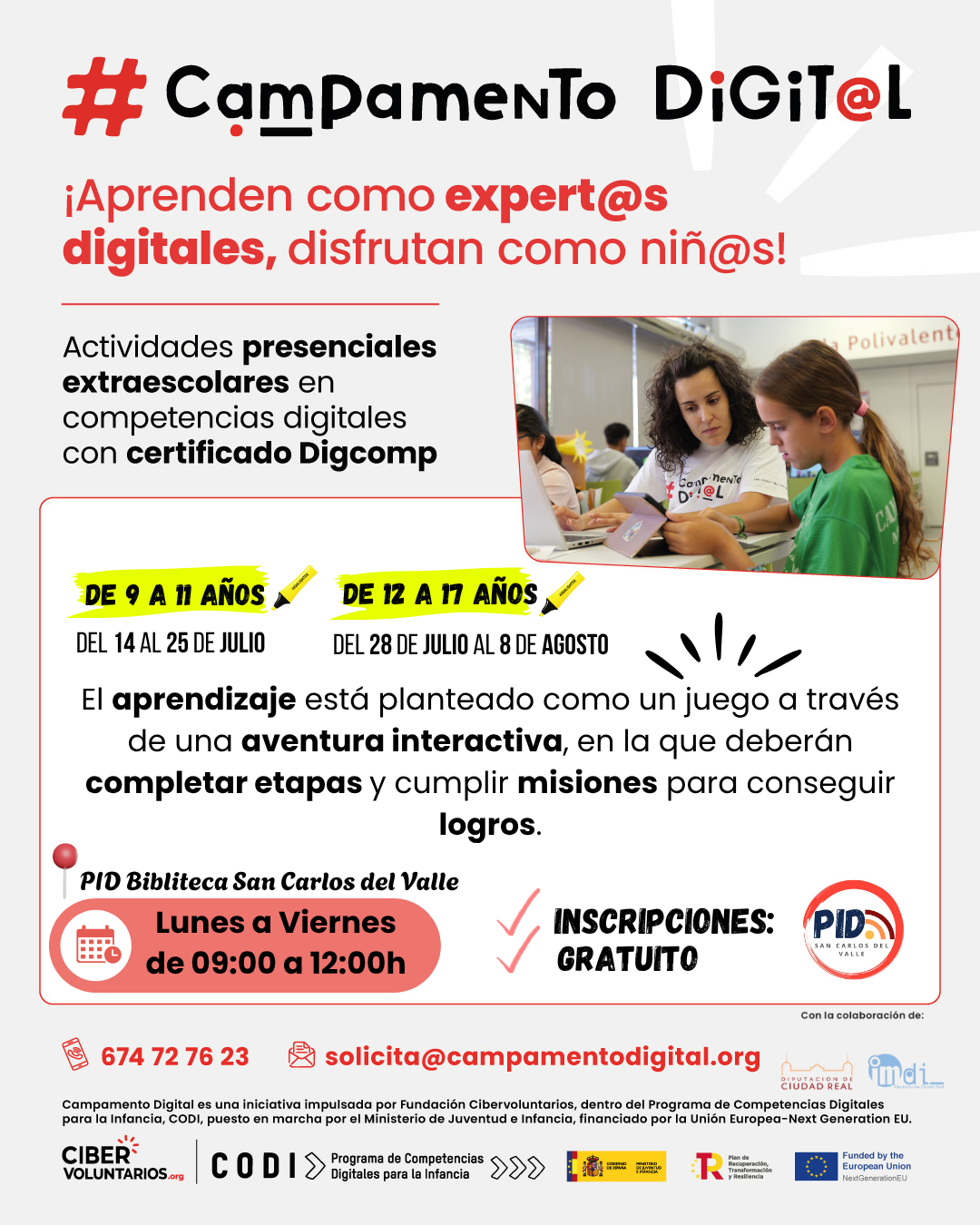 El PID de San Carlos del Valle organiza el Campamento Digit@l, con actividades presenciales extraescolares en competencias digitales con certificado Digcomp. Se llevará a cabo en la Biblioteca Municipal Carlos III y es gratuito.