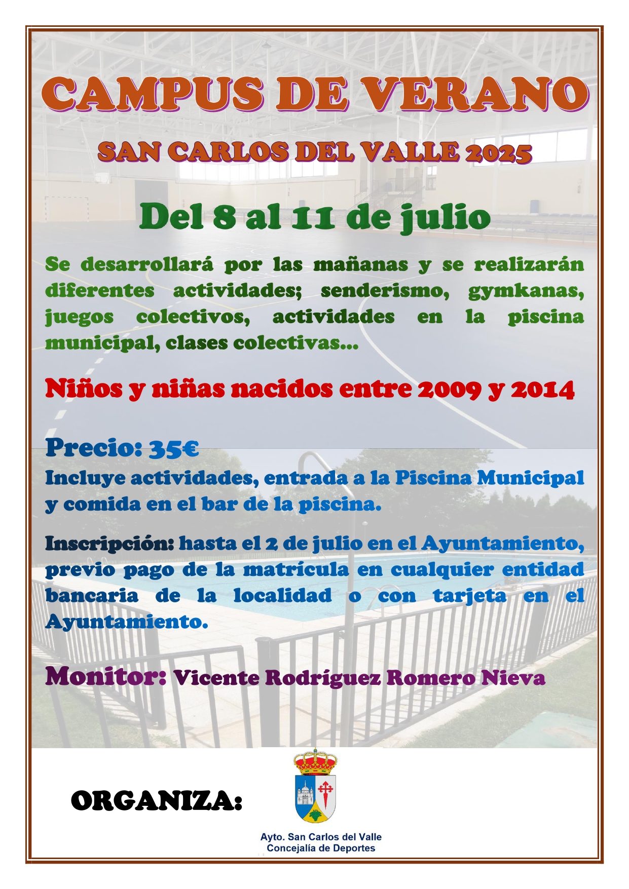 La Concejalía de Deportes organiza un campus deportivo que se desarrollará del 8 al 11 de julio y está dirigido a niños y niñas nacidos entre 2009 y 2014.Las inscripciones se pueden realizar en el Ayuntamiento hasta el 2 de julio.