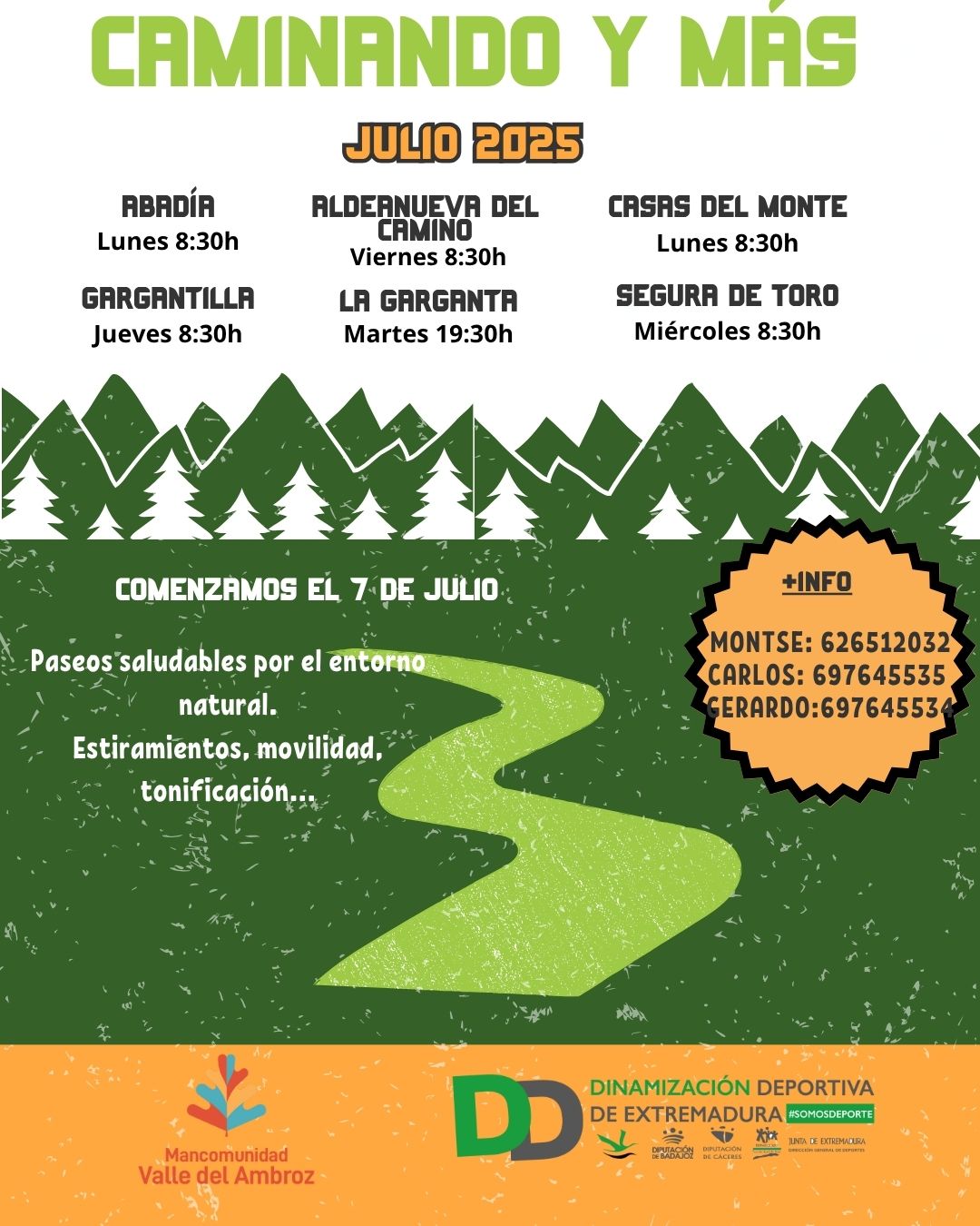 Se recuerda que el Programa "Caminando y Más" estará hoy 8 de julio de 2025 en La Garganta. La Salida es la 19:30 en la puerta del Ayuntamiento.
