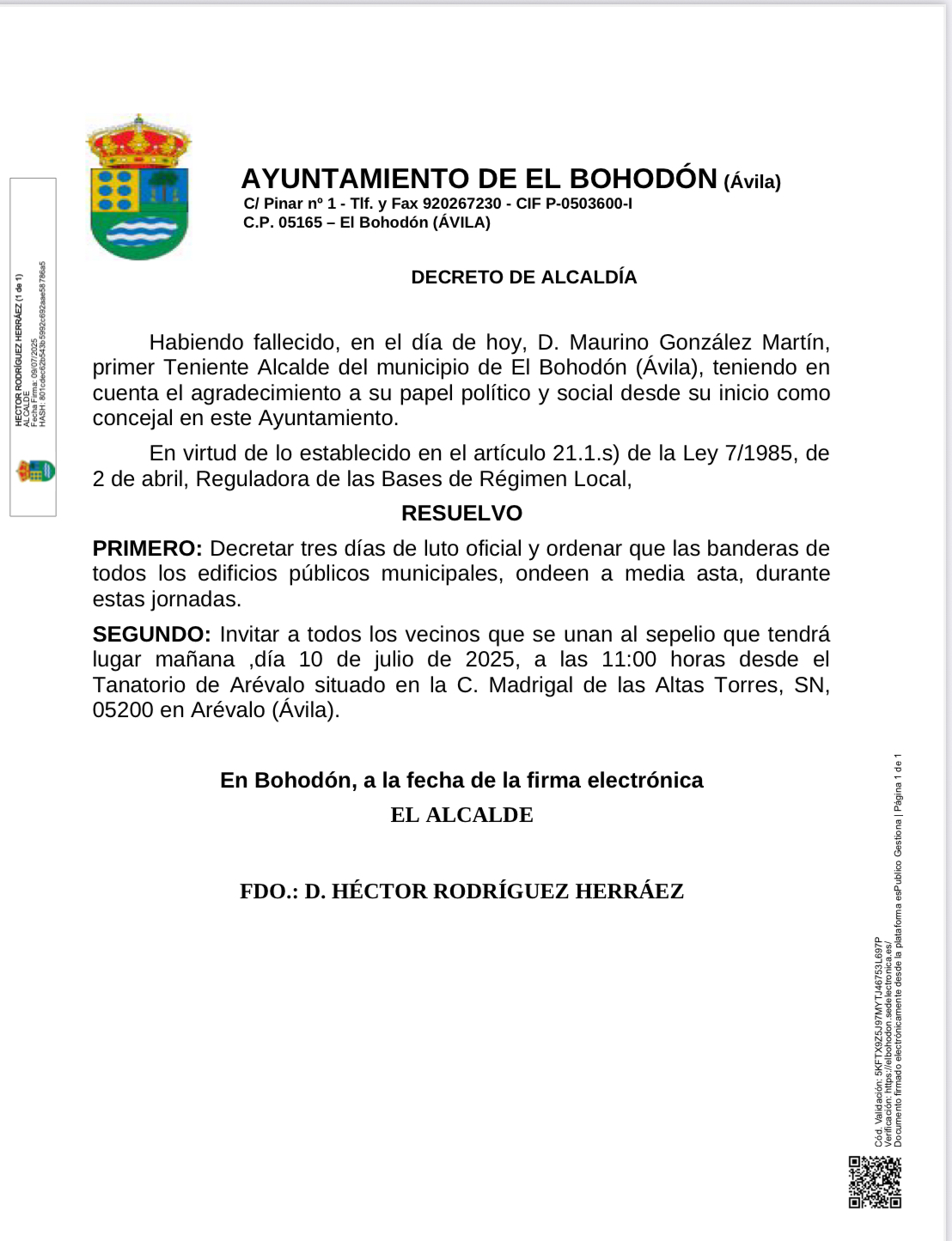 Se adjunta decreto de Alcaldía decretando luto oficial por D.Maurino González, primer teniente de alcalde de el Excmo. Ayuntamiento de El Bohodón
