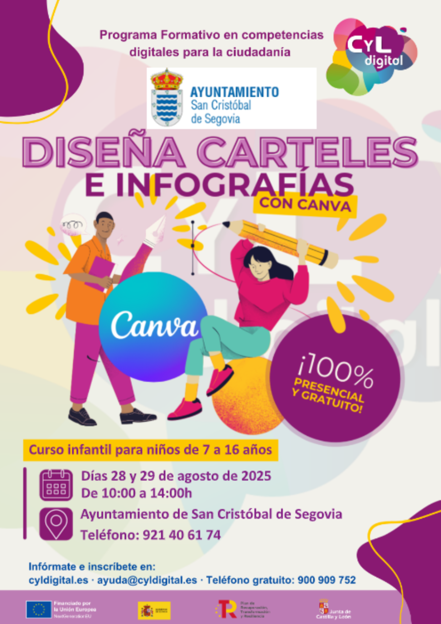 El Ayuntamiento de San Cristóbal de Segovia organiza un curso infantil presencial y gratuito para que niños y niñas de 7 a 16 años aprendan a crear carteles e infografías con Canva. ¡Una experiencia creativa única!
