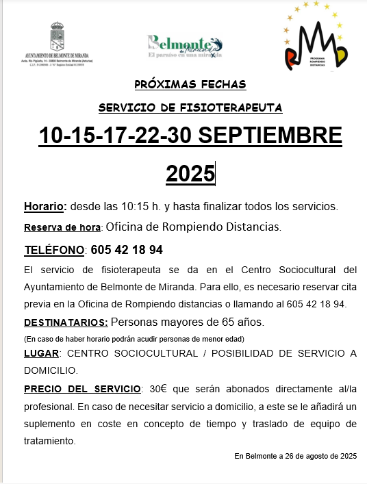 Servicio de Fisioterapeuta para el mes de SEPTIEMBRE.Solicita cita con antelación en el teléfono: 605 42 18 94.