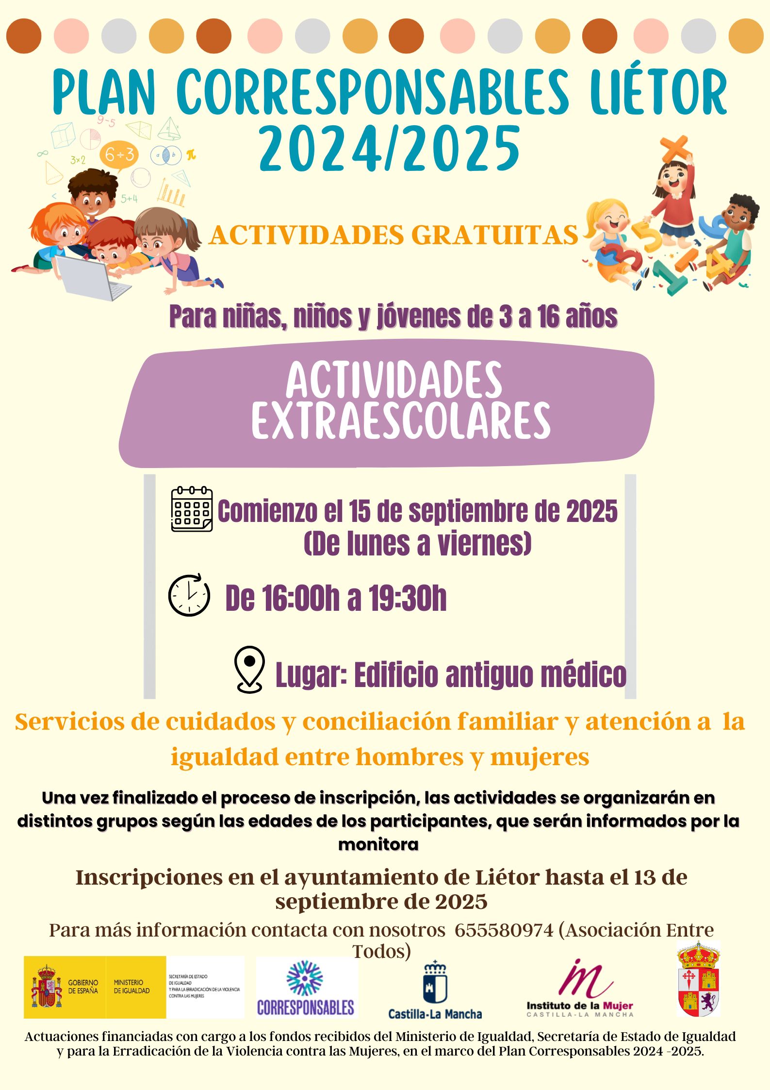El próximo día 15 de septiembre comienzan las actividades extraescolares para niños y niñas de 3 a 16 años. Inscripciones hasta el 13 de septiembre en el Ayuntamiento.