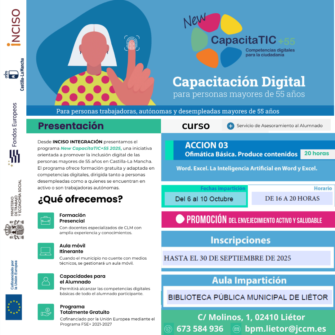 • ACCION 3: Ofimática básica. Produce contenidos. Word, Excel, la Inteligencia Artificial en Word y Excel. [Duración: 20 horas] del lunes 6 al viernes 10 de octubre, en horario de 16 a 20 h., en la Biblioteca de Liétor.