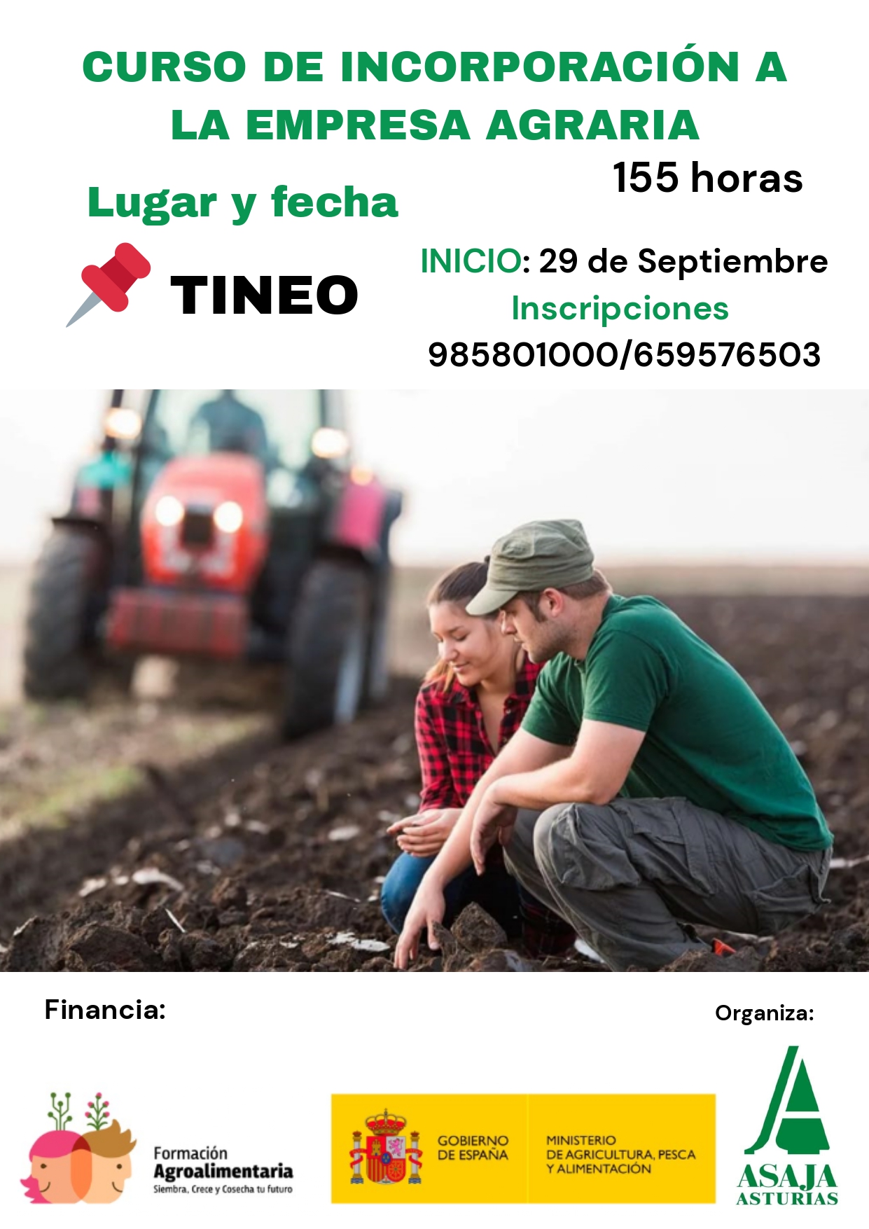 Curso de incorporación a la empresa agraria, de 155 horas, en Tineo. Fecha de inicio, el 29 de septiembre. Inscripciones en 985801000 / 659576503.Organiza: ASAJA, Asturias Se adjunta cartel.