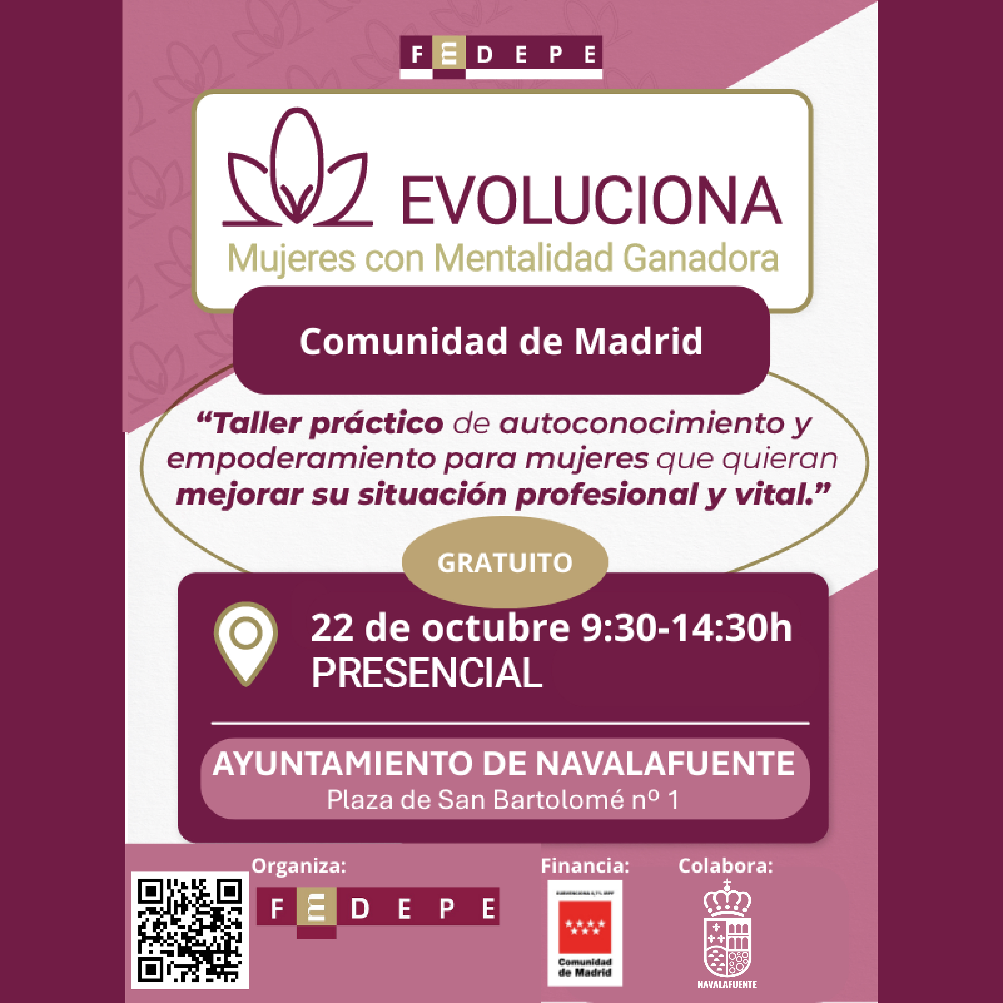 El miércoles 22 de octubre, de 9:30 a 14:30 h., te esperamos en la Sala de Plenos del Ayuntamiento de Navalafuente con el taller gratuito “Evoluciona: Mujeres con Mentalidad Ganadora”.