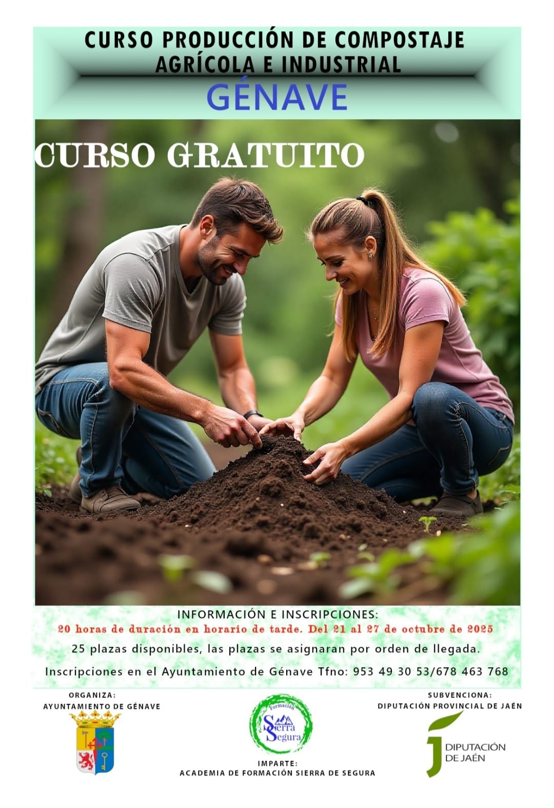 Os informamos que se va a realizar un curso gratuito en Génave acerca de "Producción de compostaje agrícola e industrial", del 21 al 27 de Octubre 2025 en horario de tarde.