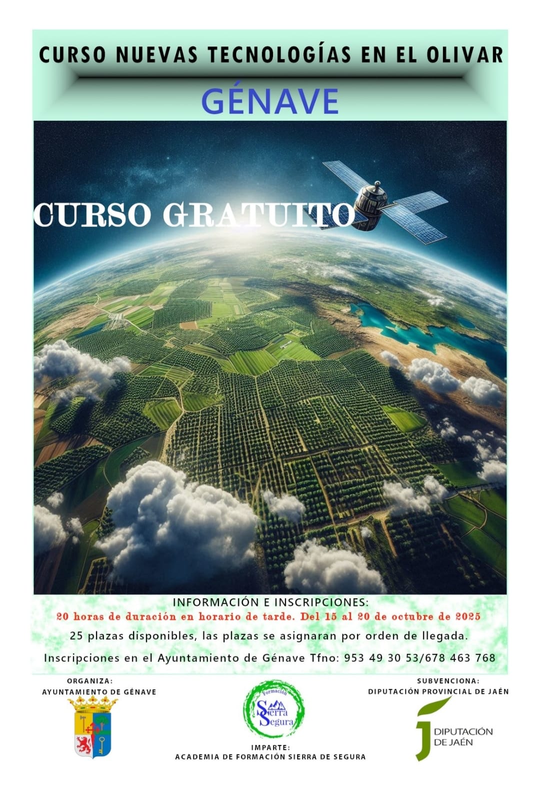Os informamos que se va a realizar un curso gratuito en Génave acerca de "Nuevas tecnologías en el olivar", del 15 al 20 de octubre 2025 en horario de tarde.