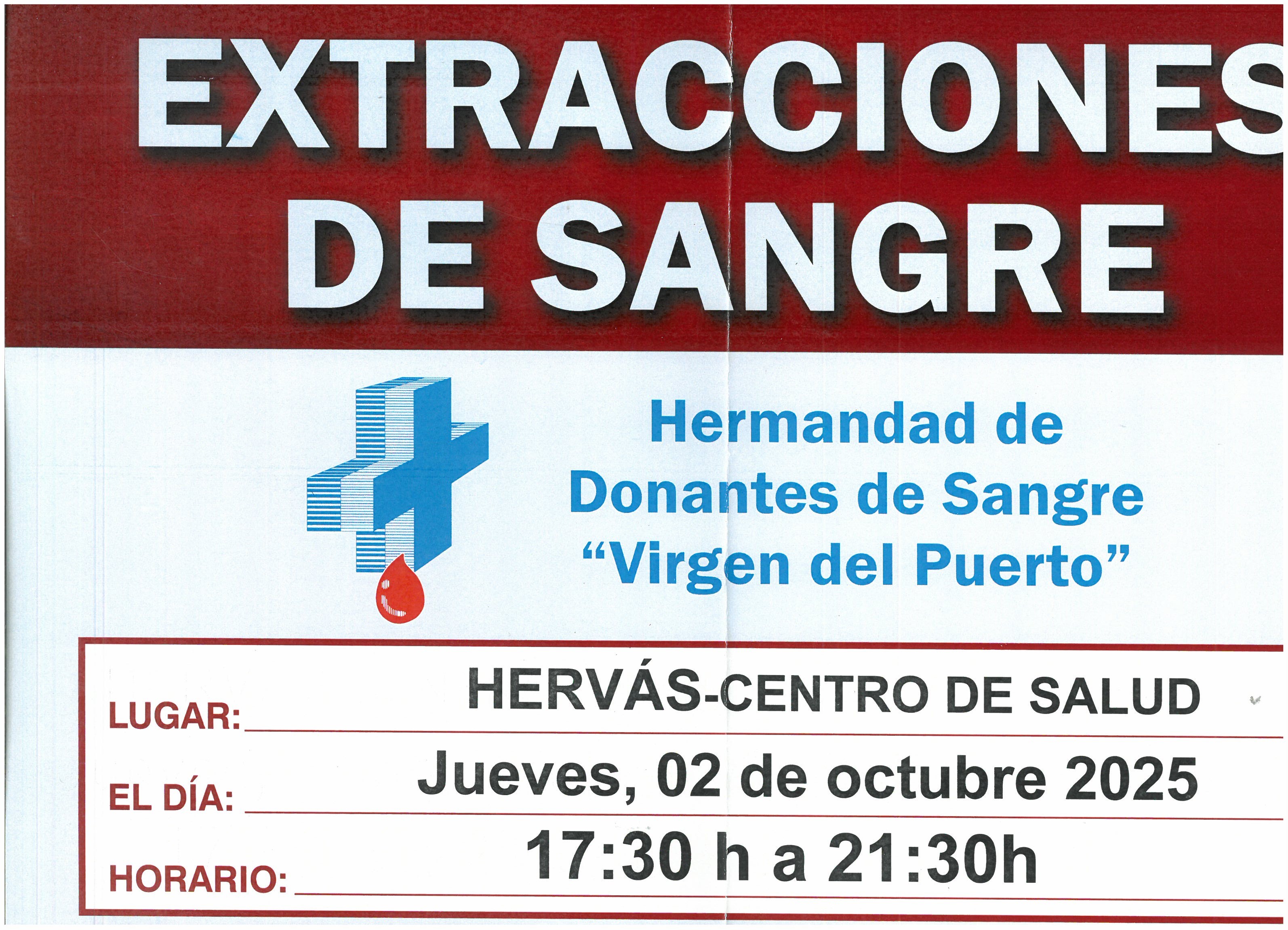 EXTRACCIONES DE SANGRE* Hermandad de Donantes de Sangre "Virgen del Puerto"** Lugar : Centro de Salud** Día : Jueves, 02 de Octubre de 2025** Hora : De 17:30 h a 21:30 h
