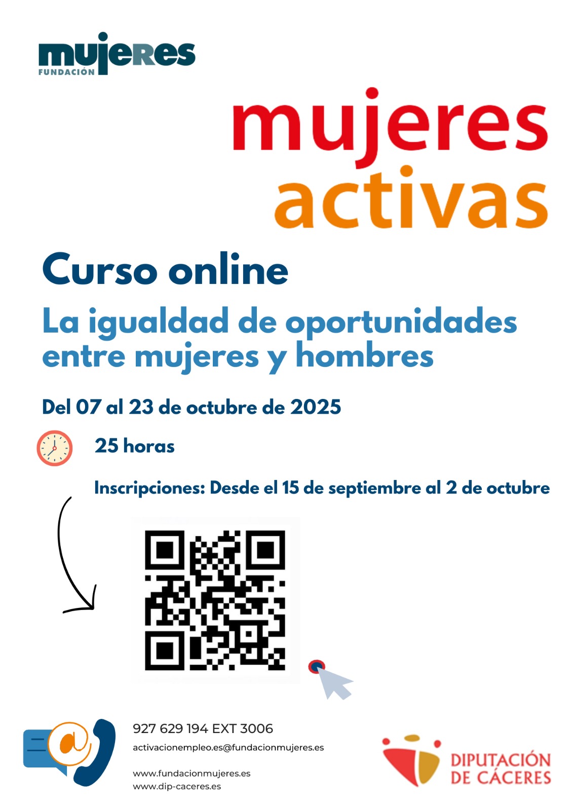 Desde FUNDACIÓN MUJERES se informa que dentro del proyecto Mujeres Activas XI , financiado por la Excma. Diputación de Cáceres, se va a comenzar a impartir el Curso online gratuito “La igualdad de oportunidades entre mujeres y hombres” .