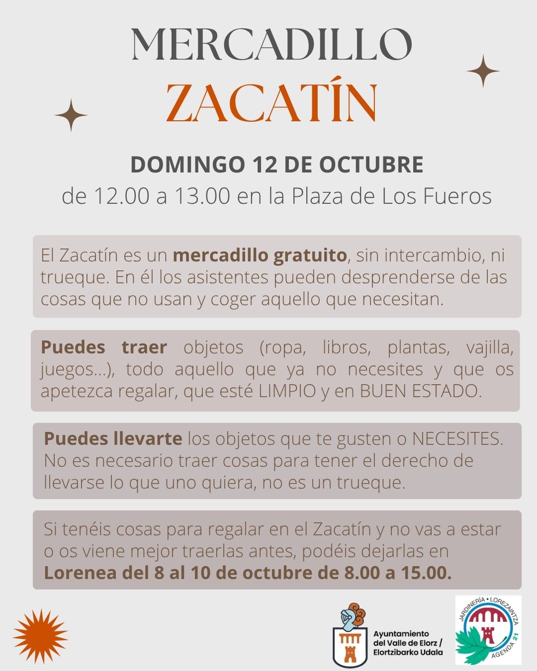 El próximo DOMINGO 12 de OCTUBRE de 12.00 a 13.30, se celebra un nuevo Zacatín en la Plaza de Los Fueros de Noáin.