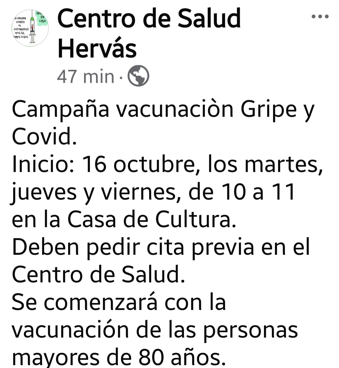 Campaña vacunación Gripe y Covid.Inicio: 16 octubreDias: Martes, Jueves y Viernes.Hora: 10:00h a 11:00hLugar: Casa de CulturaSolicitar cita previa en Centro de Salud. Se comenzará la vacunación de las personas mayores de 80 años.