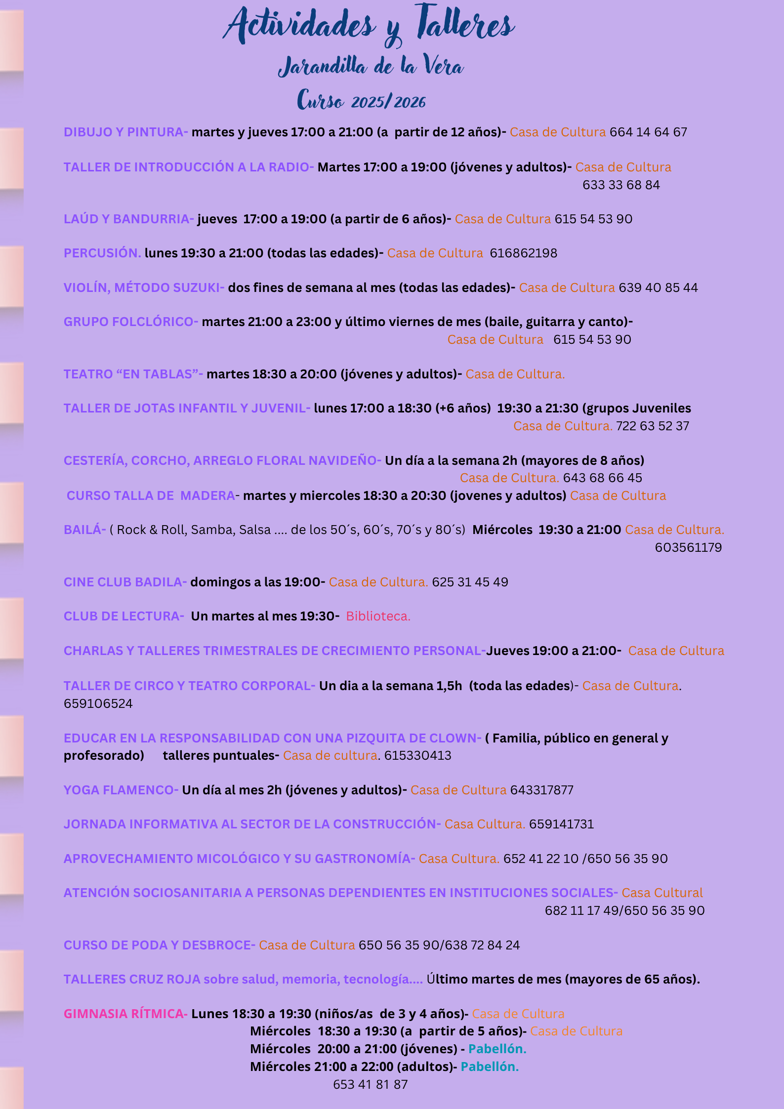"¡ Ya están aquí nuestros talleres y actividades 2025/2026! Cultura, deporte, creatividad y diversión todo el año "📞 Llama y reserva tu plaza en aquella que más te guste. 2 Carteles Adjuntos