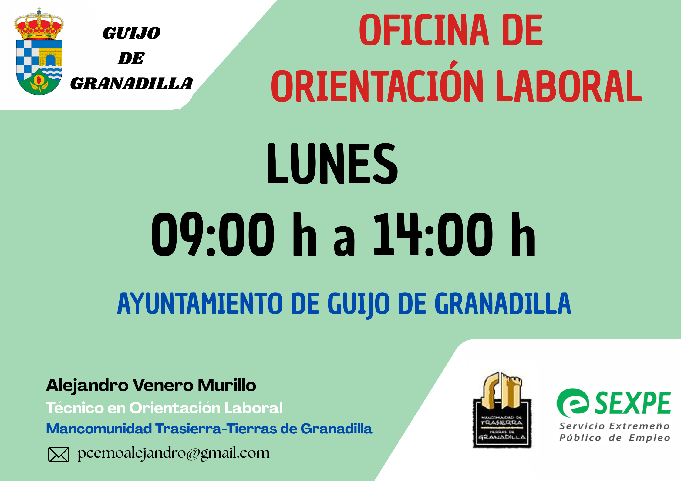 Te esperamos todos los lunes, de 09:00 h a 14:00 h, en el Ayuntamiento de Guijo de Granadilla.