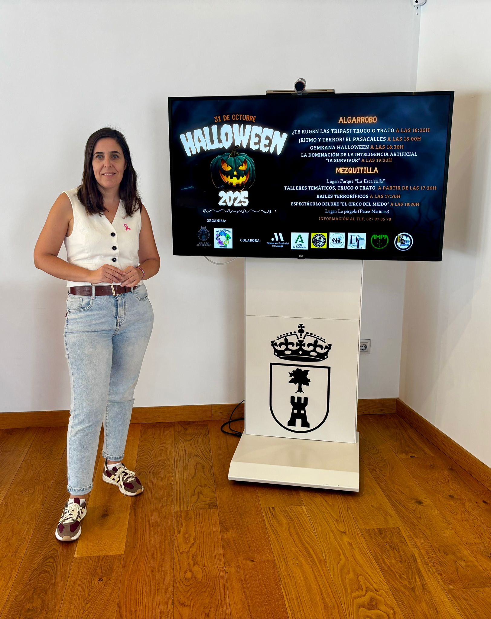 La concejala de juventud, Mª Ángeles Lozano, presenta la programación completa de actividades para celebrar Halloween 2025 en el municipio de Algarrobo y Mezquitilla.