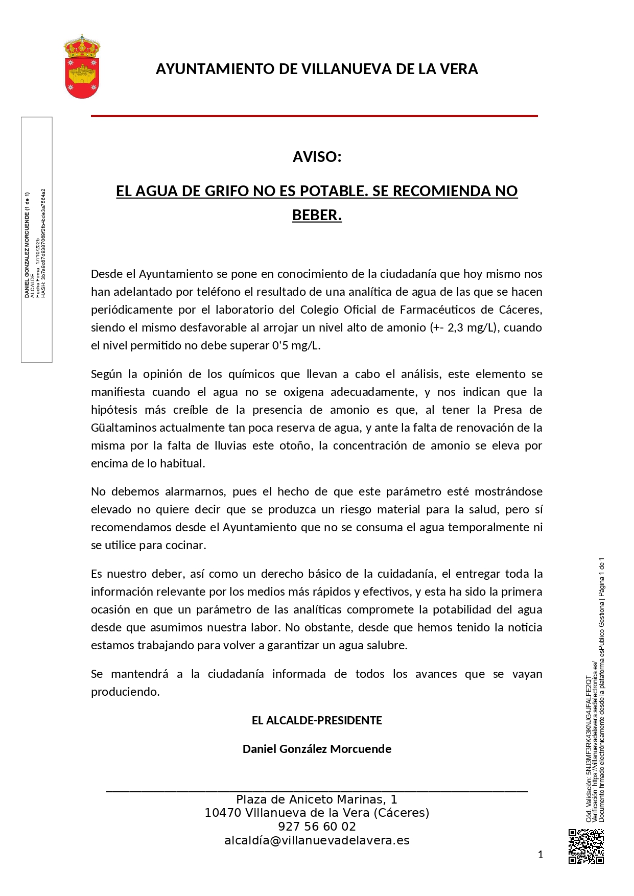 Desde el Ayuntamiento se pone en conocimiento de la cuidadanía que hoy mismo nos han adelantado por teléfono el resultado de una analítica de agua de las que se hacen periódicamente por el laboratorio del Colegio Oficial de Farmacéuticos de Cáceres, siendo el mismo desfavorable al arrojar un nivel alto de amonio (+- 2,3 mg/L), cuando el nivel permitido no debe superar 0'5 mg/L.