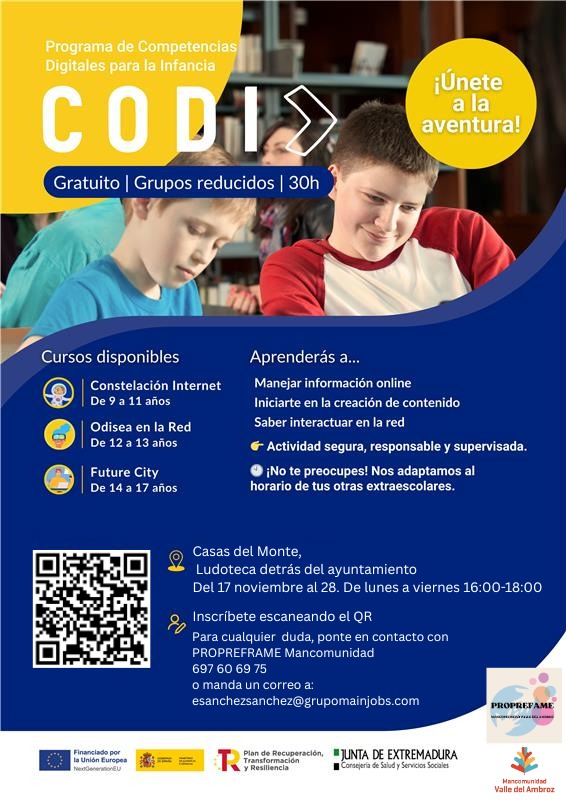 Se adjunta cartel informativo del Programa de Competencias Digitales para la Infancia, que tendrá lugar en la Ludoteca del 17 al 28 de noviembre. De lunes a viernes de 16:00h a 18:00 horas.