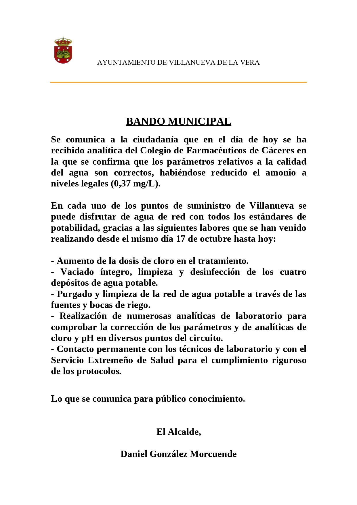 Se comunica a la ciudadanía que en el día de hoy se ha recibido analítica del Colegio de Farmacéuticos de Cáceres en la que se confirma que los parámetros relativos a la calidad del agua son correctos, habiéndose reducido el amonio a niveles legales (0,37 mg/L).