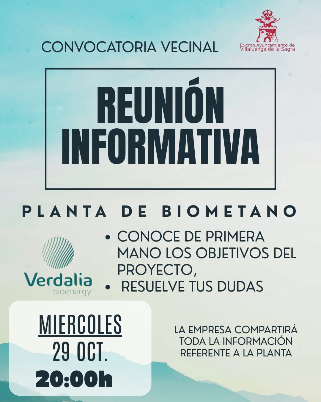 El próximo miércoles, la empresa responsable de la Planta de Biogás en nuestro municipio, Verdalia, invita a todos los vecinos de Villaluenga de la Sagra a una reunión informativa para explicar los detalles del proyecto de implantación de la nueva planta de biogás y cómo esta puede influir en el desarrollo de nuestro municipio.