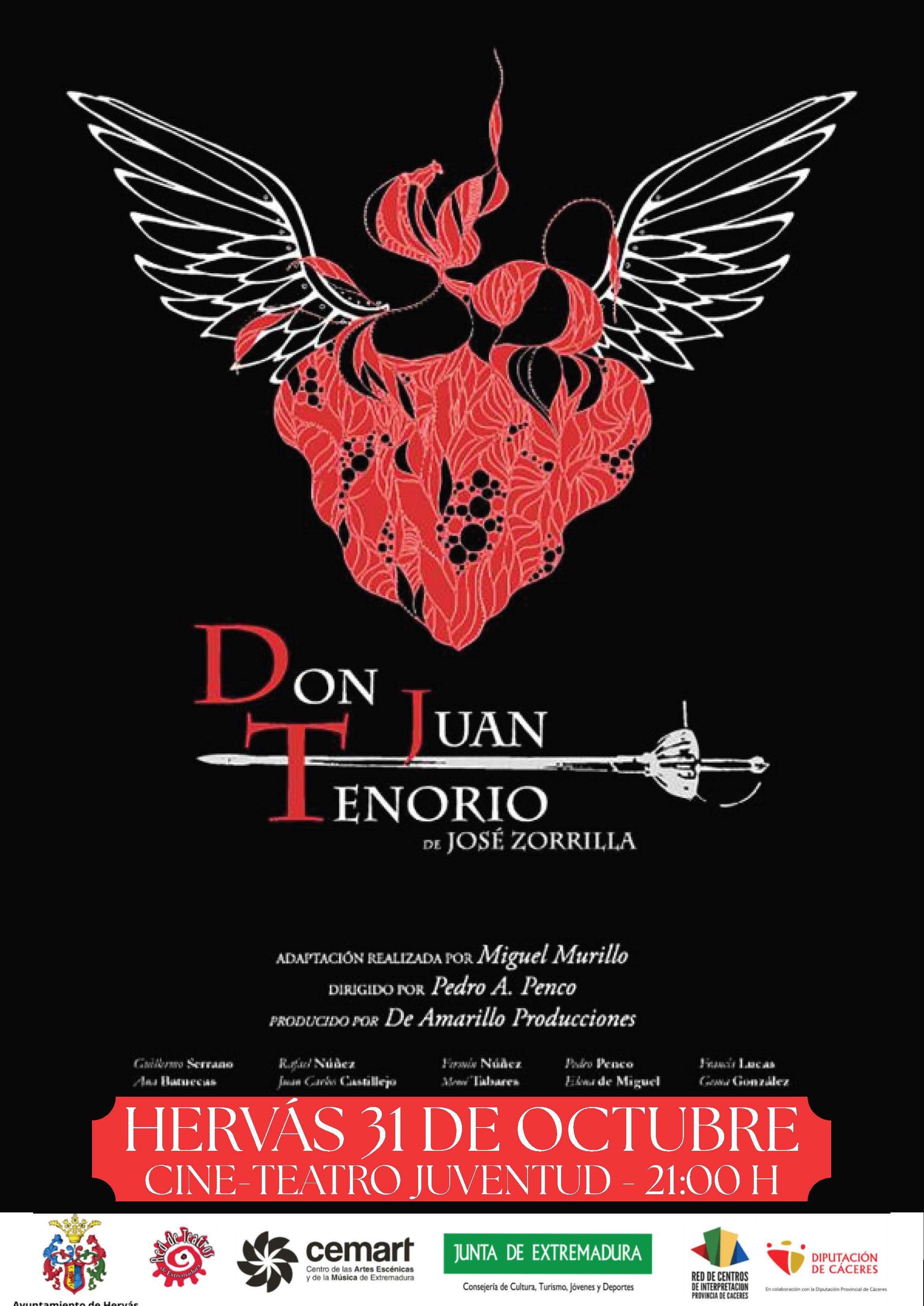 Se adjunta información sobre la próxima representación que tendrá luegar en el Cine-Teatro Juventud de Hervás. Se trata de "Don Juan Tenorio" de José Zorilla, texto de Miguel Murillo y dirección de Pedro A. Penco, de la compañía extremeña De Amarillo Producciones. Tendrá lugar el Viernes 31 de Octubre, a las 21.00 horas. Las entradas cuestan 5€, están disponibles en el siguiente enlace: https://www.giglon.com/todos?idEvent=don-juan-tenorio-caceres y en taquilla antes de la función.