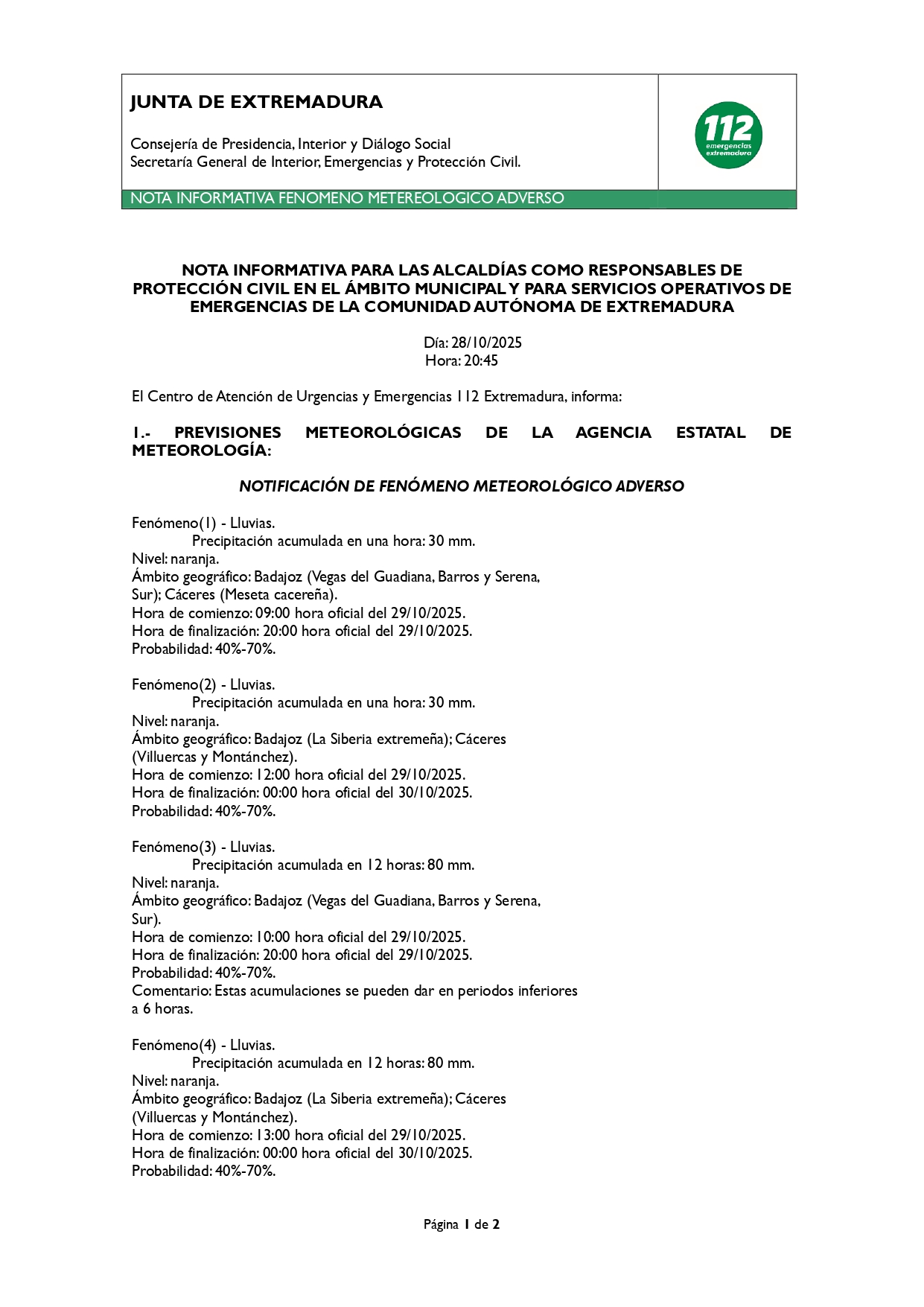 Publicamos información recibida del 112 sobre alerta naranja por fuertes precipitaciones.