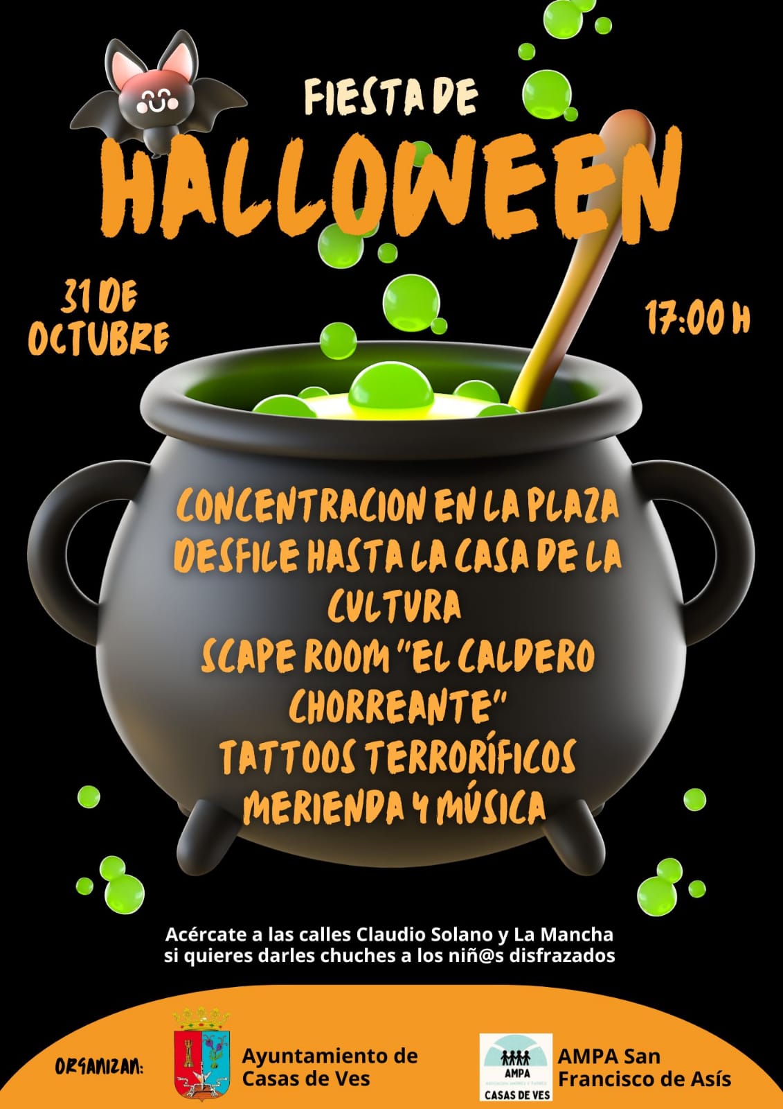 Este viernes acude con tu disfraz a la Plaza Mayor y prepárate para todas las actividades que hemos organizado el AMPA y el Ayuntamiento. Si quieres acercarte a ver el desfile también te invitamos para que les deis chuches a los niñ@s.