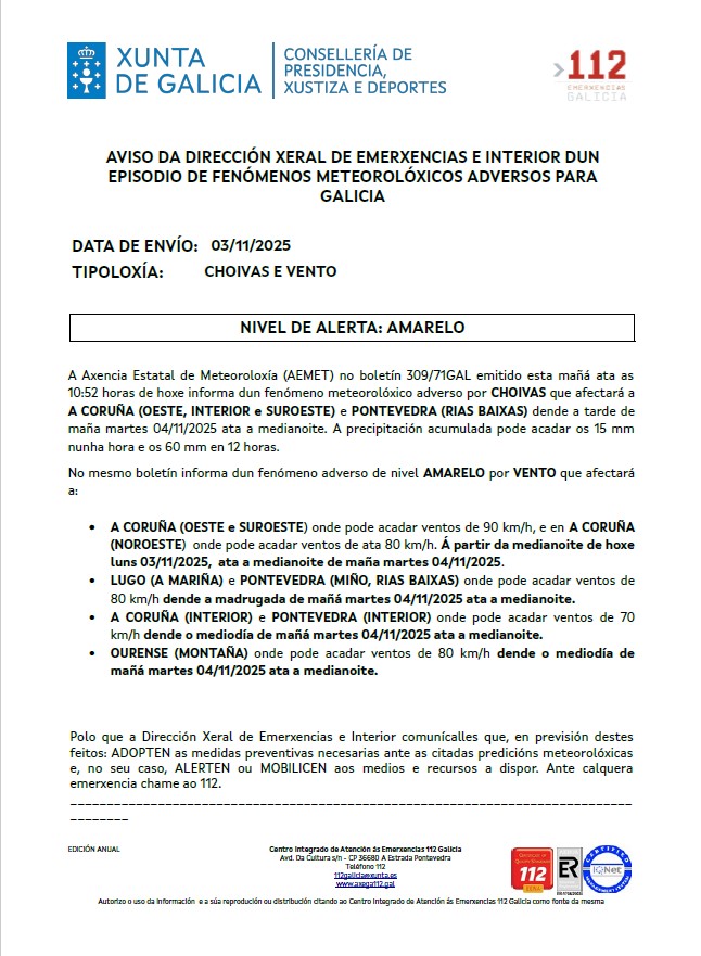 A Axencia Estatal de Meteoroloxía (AEMET) no boletín 309/71GAL emitido esta mañá ata as 10:52 horas de hoxe informa dun fenómeno meteorolóxico adverso por CHOIVAS que afectará a A CORUÑA (OESTE, INTERIOR e SUROESTE) e PONTEVEDRA (RIAS BAIXAS) dende a tarde de maña martes 04/11/2025 ata a medianoite. A precipitación acumulada pode acadar os 15 mm nunha hora e os 60 mm en 12 horas.