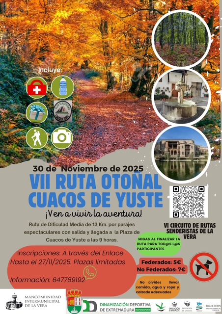 La Alcaldía de Cuacos de Yuste informa que ya está abierto el plazo de inscripción para la VII Ruta Otoñal de Cuacos de Yuste, que se celebrará el domingo, 30 de noviembre de 2025, con salida desde la Plaza de España.