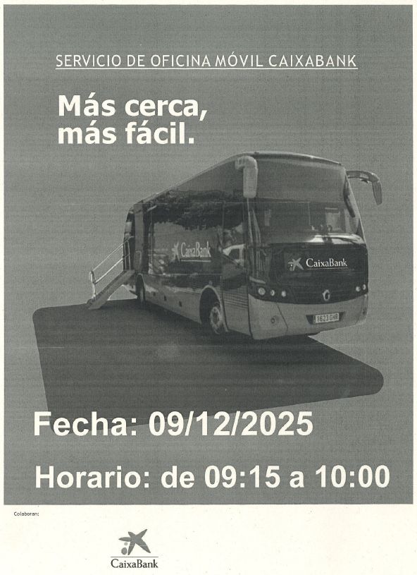 Mañana martes 9 de Diciembre de 9:15 a 10:00h Oficina móvil Caixabank.