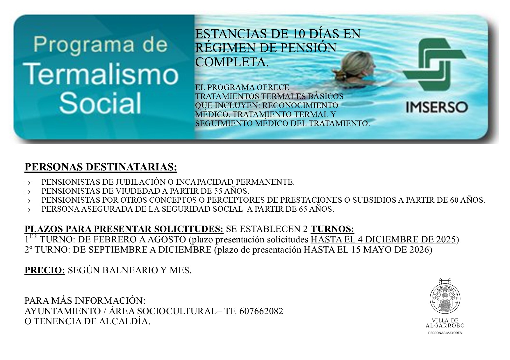 El Programa de Termalismo Social del IMSERSO ofrece estancias de 10 días en régimen de pensión completa 🏨, con tratamientos termales básicos que incluyen reconocimiento médico 🩺, tratamiento termal 💦 y seguimiento médico 👩⚕️. Está dirigido a pensionistas de jubilación o incapacidad permanente, de viudedad a partir de 55 años, pensionistas por otros conceptos o perceptores de prestaciones o subsidios desde los 60 años, así como a personas aseguradas de la Seguridad Social mayores de 65 años 👴👵. Existen dos turnos: el primero de febrero a agosto (plazo hasta el 4 de diciembre de 2025) y el segundo de septiembre a diciembre (plazo hasta el 15 de mayo de 2026) 📅. El precio varía según el balneario y el mes 💰. Para más información ℹ️, se puede contactar con el Ayuntamiento / Área Sociocultural al teléfono ☎️ 607 662 082 o acudir a la Tenencia de Alcaldía.