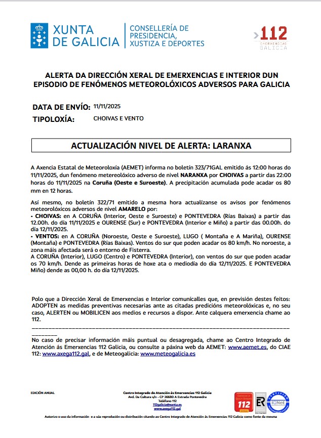 A Axencia Estatal de Meteoroloxía (AEMET) informa no boletín 323/71GAL emitido ás 12:00 horas do 11/11/2025, dun fenómeno metereolóxico adverso de nivel NARANXA por CHOIVAS a partir das 22:00 horas do 11/11/2025 na Coruña (Oeste e Suroeste). A precipitación acumulada pode acadar os 80 mm en 12 horas.