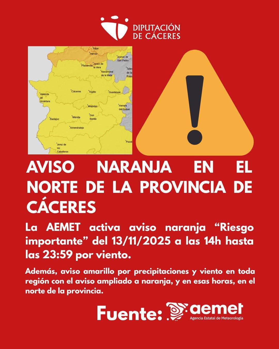 La AEMET activa aviso naranja "Riesgo importante" del 13/11/2025 a las 14h hasta las 23:59 por viento.